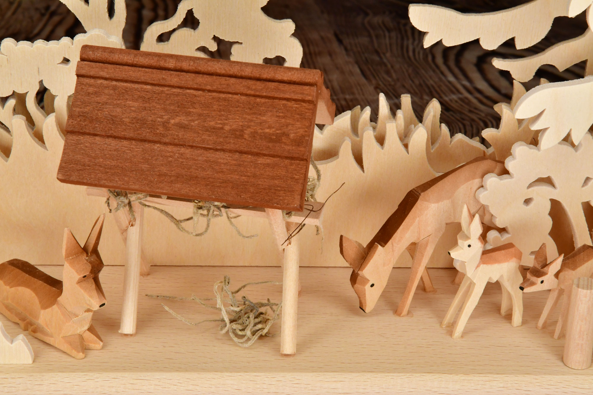Am Himmel funkeln die Sterne und in der Futterkrippe liegt duftendes Heu. 6 Rehe haben sich hier eingefunden. Während die meisten friedlich äsen, behält eines von ihnen aufmerksam die Gegend im Auge. Alle Figuren im 3D-Schwibbogen sind liebevoll von Künstlerhand geschnitzt und bemalt. Der sie umgebende, lauschige Bergwald ist eine detailreiche Laubsägearbeit aus 3 mm Birkensperrholz. Die beschauliche Szenerie wird durch die indirekte LED-Beleuchtung romatisch beleuchtet. Ein wundervolles Geschenk für friedliche Stunden.