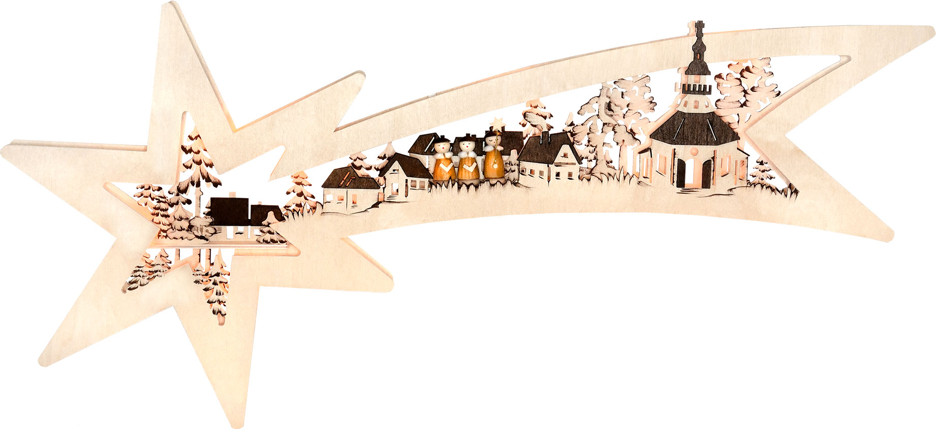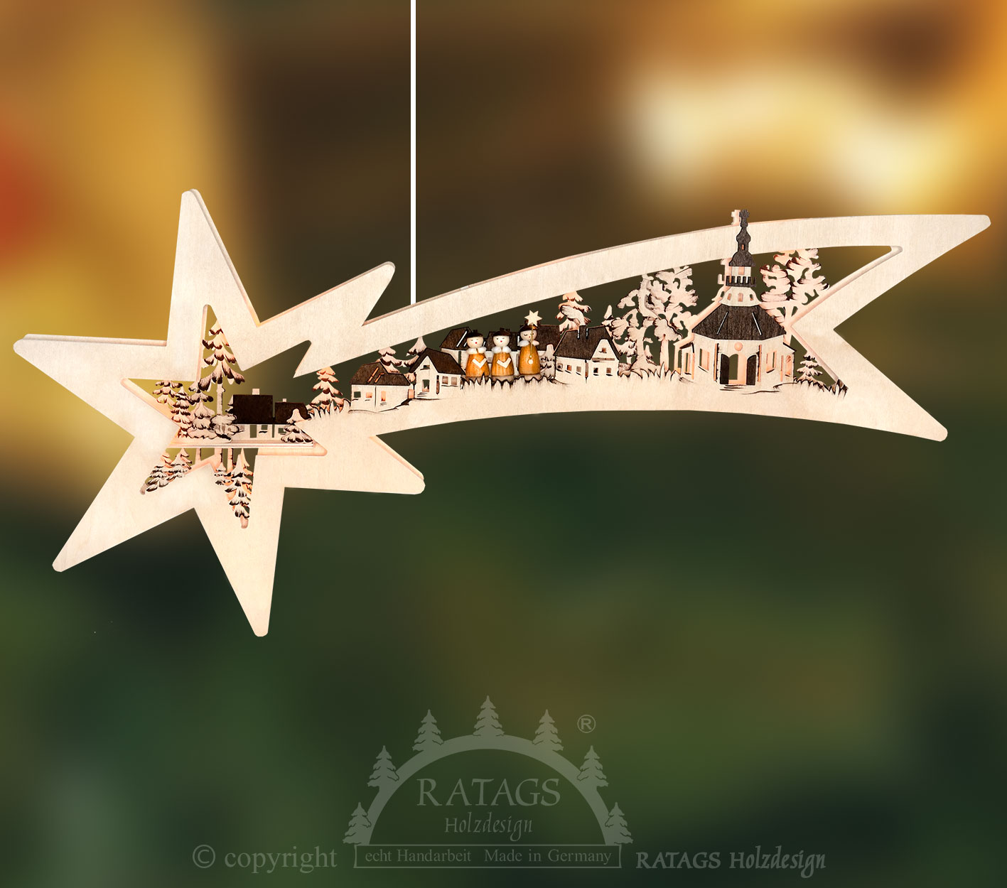 Größe: ca. 58 cm (B) Beleuchtung: LED-Stripe Dieses Fensterbild wurde als ein beleuchteter Sternschweif mit dem Dorf Seiffen und Kurrende gefertigt. Die Dächer wurden farbig gestaltet. Die indirekte, blendfreie LED-Beleuchtung sorgt für eine stimmungsvolle Raumatmosphäre. Echte Handarbeit aus dem Hause RATAGS - Made in Germany - 100% original Erzgebirge
