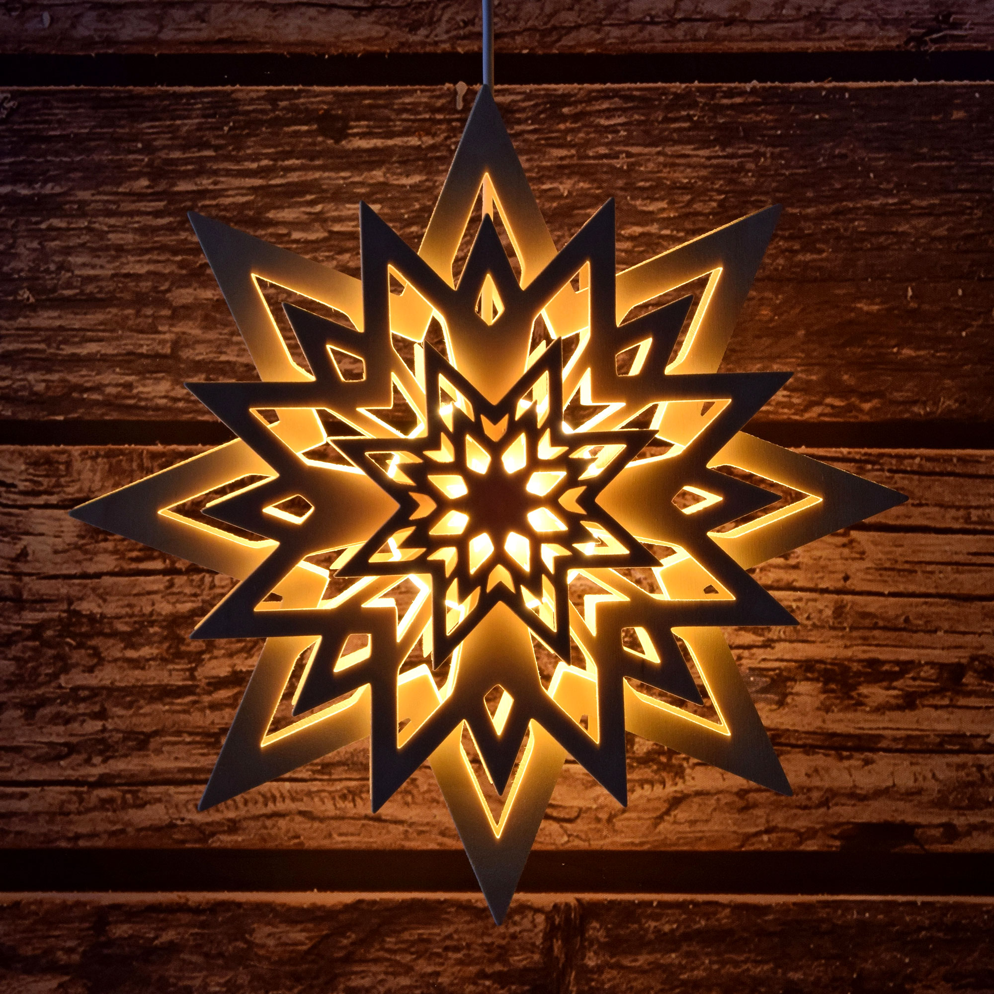 Eine liebevoll gestaltete Neuheit aus dem Hause RATAGS. Dieses Fensterbild aus hellem Birkensperrholz in Form eines ornamentalen Sterns wird von einem LED-Stripe aus der Mitte heraus blendfrei beleuchtet. Die dreidimensionale Erscheinung mit ihrem hellen Lichtkranz im Zentrum zieht den Blick wie ein Mandala in seinen Bann. Durch Licht und Schatten werden wundervolle Effekte werden auf Ihre Wand gezaubert. Ein ultimativer Hingucker. Ein schönes Stück erzgebirgischer Holzkunst für das ganze Jahr.