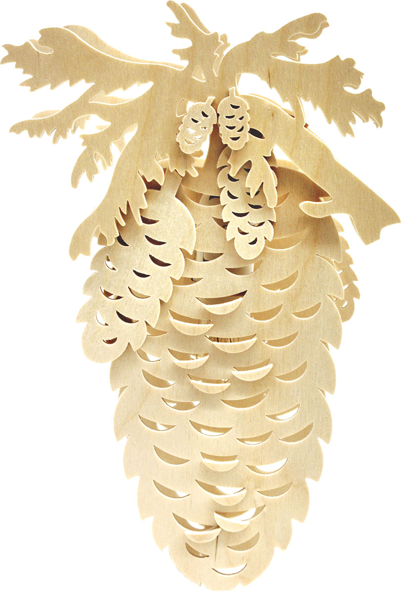 Beleuchtetes Fensterbild in Zapfenform aus naturbelassenem Birkensperrholz.