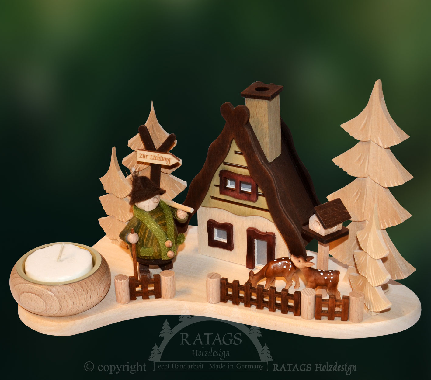Größe: ca. 23 x 11 cm (BxH) Funktion: mit Räucherbaum Dieser Tischschmuck wurde als ein kleines Wildgehe produziert. Das besondere daran ist, dass das Bäumchen ein Räucherbaum ist. Das Häuschen und die Krippe wurden hellbraun gebeizt. echte Handarbeit aus dem Hause RATAGS - Made in Germany - 100% original Erzgebirge