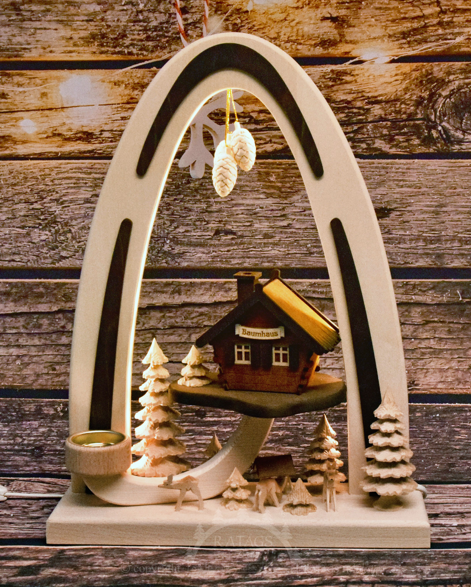 Dieser moderne Massivholzbogen aus dem Hause RATAGS zeigt ein erhaben stehendes Baumhaus umstanden von Wald, einer Futterkrippe und Rehen. Figuren, Bäume und Tannenzapfen sind in Massivholz ausgeführt. Die indirekte Beleuchtung verbreitet eine stimmungsvolle Atmosphäre.