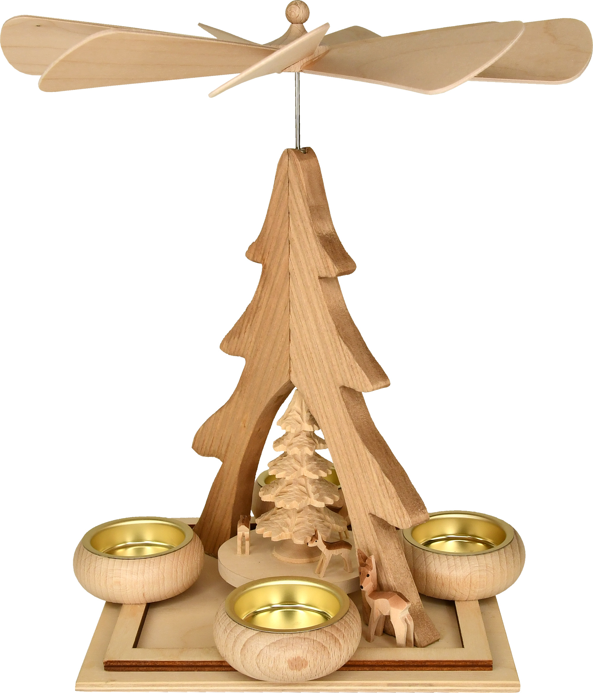 Klassische Tischpyramide mit drehendem Teller mit Massivholzbestückung (Tanne und 4 Rehe). 4 Teelichte sorgen für eine lange Laufzeit.