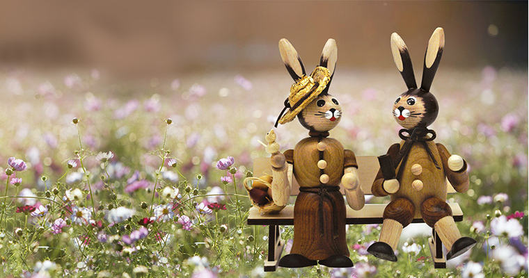 Größe ca. 8 x 7 cm Echte Handarbeit - Made in Germany - 100 % Original Erzgebirge Zwei Häschen aus der Reihe unserer knuffigen Hasenbande beim Sonnenbad. Drink, Blume und Osternest inklusive.