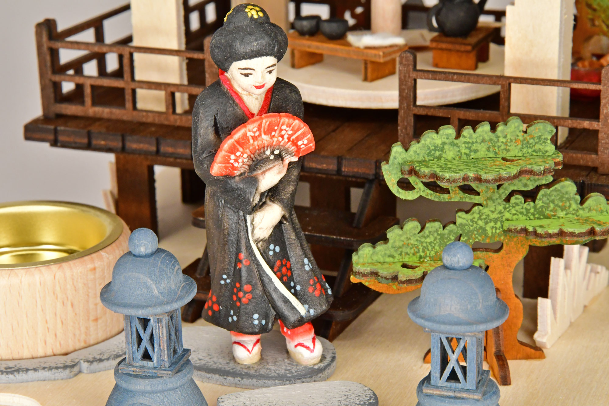 Eine wunderbar exotische Neuheit aus dem Hause RATAGS mit fernöstlichem Flair: Das Land der aufgehenden Sonne festgehalten in einer Tischpyramide. Eine colorierte Geisha steht mit einem Fächer in der Hand vor einem Teehaus, dem Chashitsu. Das freistehende Teehaus, das speziell für diesen Zweck errichtet ist, fügt sich traditionell in einen umgebenden japanischen Garten ein. Tassen und Krug drehen sich auf dem Pyramidenteller, angetrieben durch 2 Teelichte. Das klassische Licht- und Schattenspiel des Flügelrades verbreitet eine stimmungsvolle Atmosphäre.
