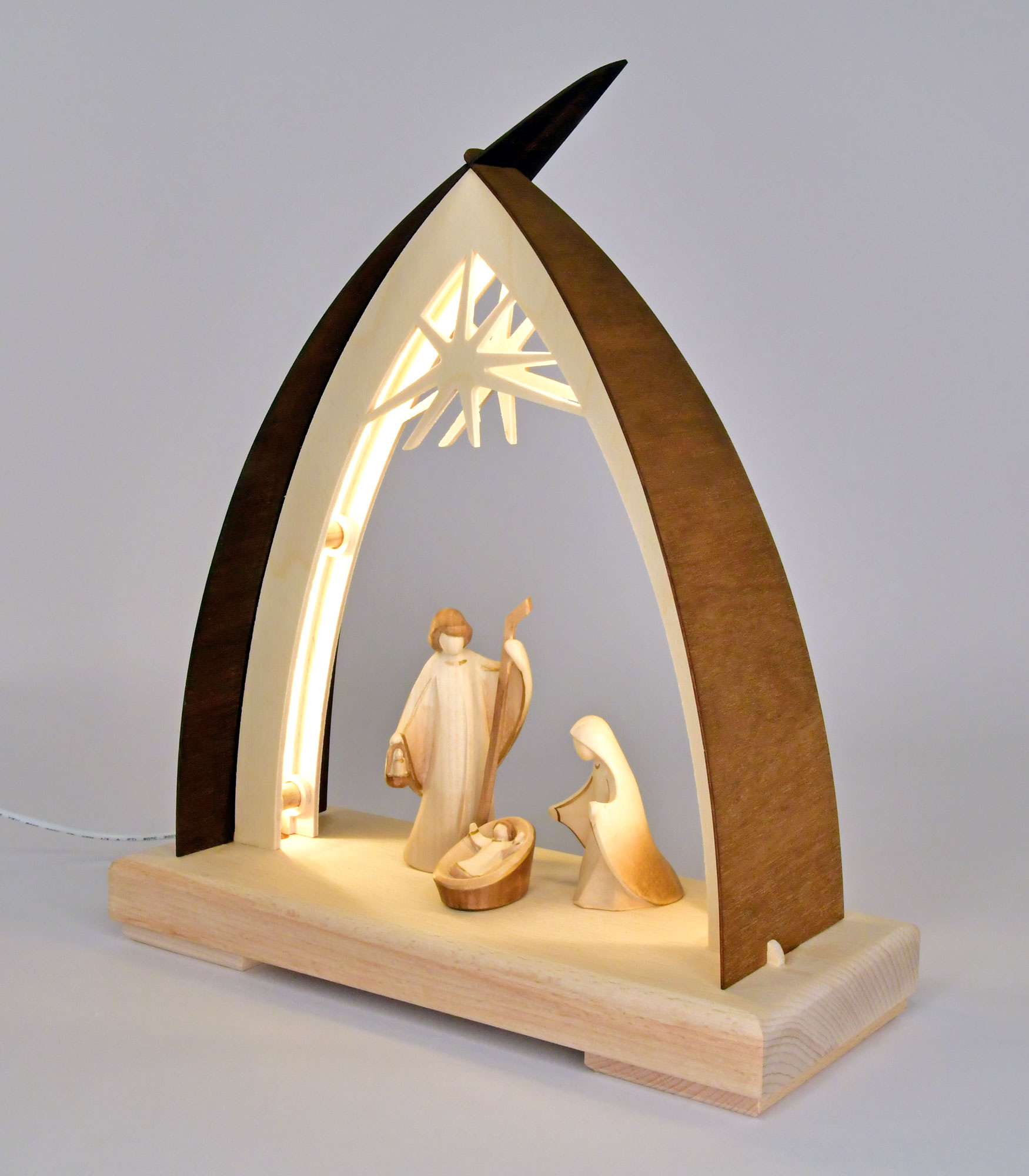 Diese hochwertige Handarbeit aus dem Hause RATAGS stellt eine moderne Interpretation des Schwibbogens dar. Gerahmt von einem kontrastreich gebeizten Dach aus feinem Birkensperrholz bildet dieser Schwibbogen den Ursprung des Weihnachtsfestes im Stall von Bethlehem nach. Edle Tiroler Massivholzfiguren stehen im Mittelpunkt unter dem Stern von Bethlehem. Das Licht dringt hell aber unaufdringlich aus dem Bogenrahmen und verleiht der Szene ein festliches Gepräge. Joseph und Maria verharren in ehrfürchtigem Gestus der Gegenwart ihres Kindes. Alles Unaufdringliche gerät in den Hintergrund. Die Ausstattung mit USB-Stromversorgung ermöglicht eine dezentrale Aufstellung.
