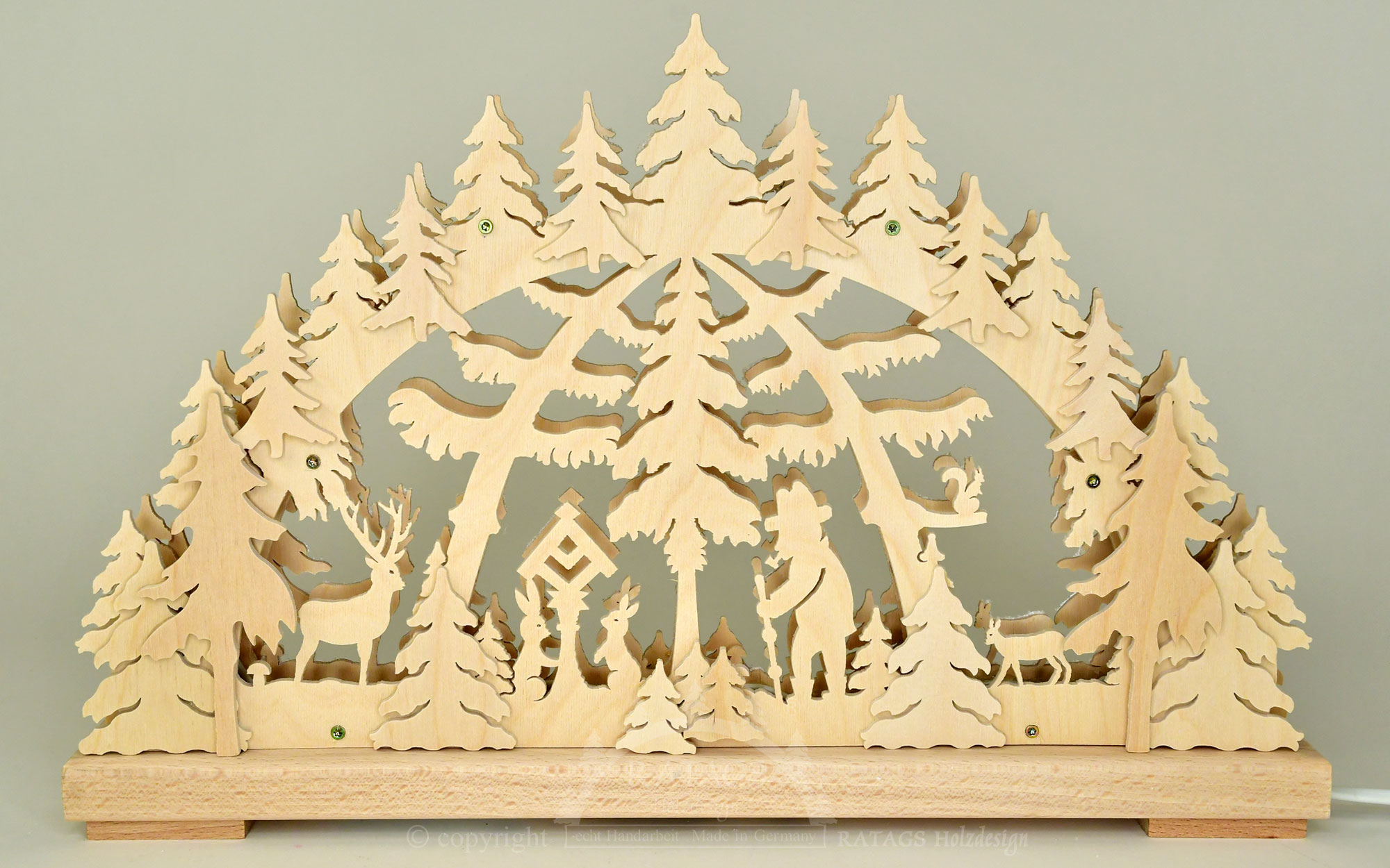 Bei einem gemütlichen Waldspaziergang trifft ein Wanderer mit Hut, Pfeife und Spazierstock auf die Tiere des Waldes, wie Hasen, Eichhörnchen, Reh und Hirsch mit imposantem Geweih. Der mit LED indirekt beleuchtete Doppelschwibbogen ist eine filigrane Laubsägearbeit aus 3 mm Birkensperrholz.