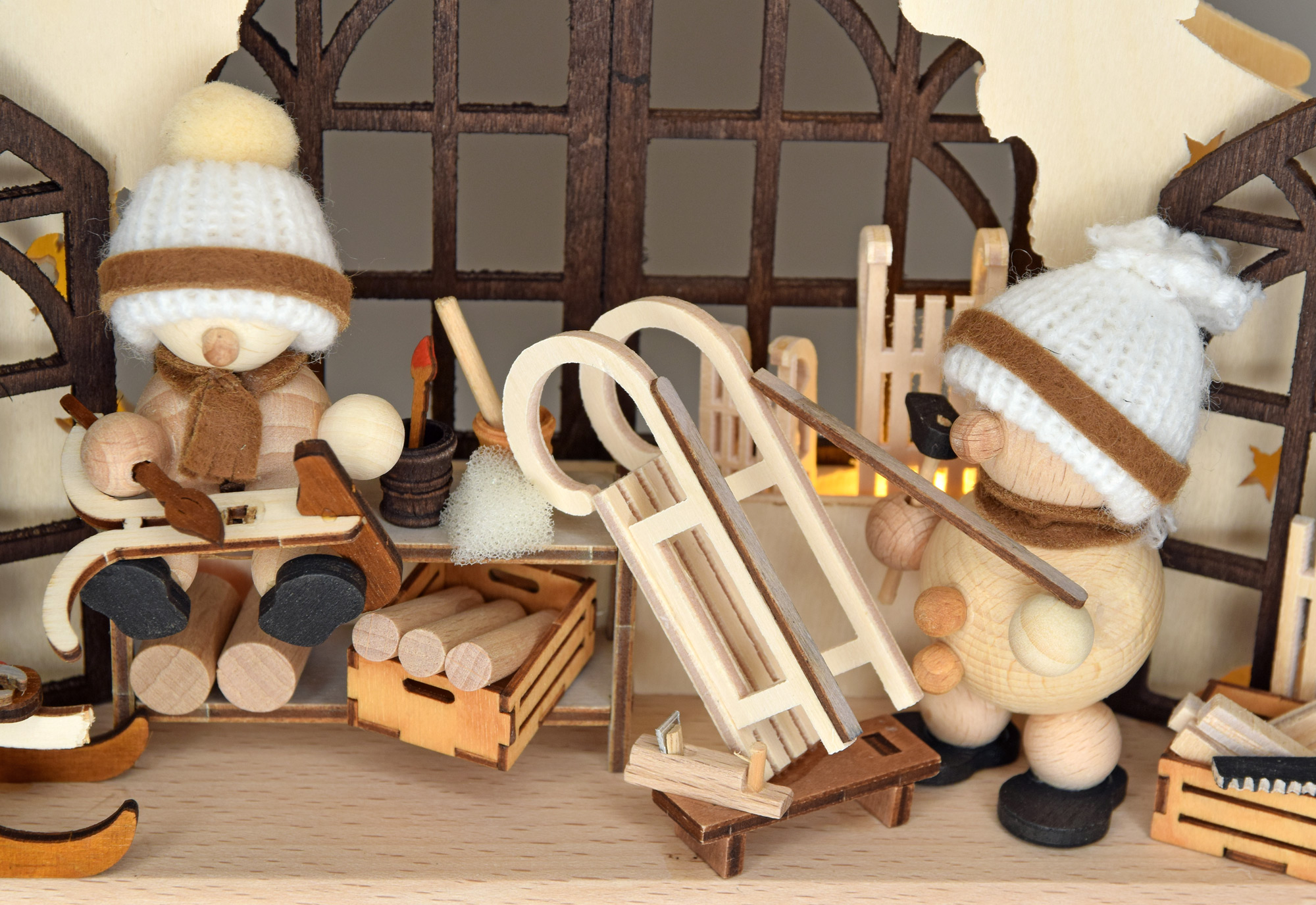 ACHTUNG! Die Abbildung ist OHNE Raureif. Der gewählte Artikel D9990-544-9-R ist jedoch MIT Raureif. Größe: 43 x 29 x 7 cm (BxH) Beleuchtung: LED, 10-teilig Ausführung: Raureif Ein Stück traditioneller Handwerkskunst im Erzgebirge ist das Spanbaumstechen, als eines der ältesten Handwerke. In diesem 3D Schwibbogen mit indirekter LED Beleuchtung wird dieses einmalige Handwerk in einer Schauwerkstatt dargestellt. Auf der handgefertigten Drehbank ist ein fertiger Spanbaum eingespannt. Die Bäumchen werden aus geradlinig gewachsenem Lindenholz gefertigt. Echte Handarbeit aus dem Hause RATAGS - Made in Germany - 100% original Erzgebirge