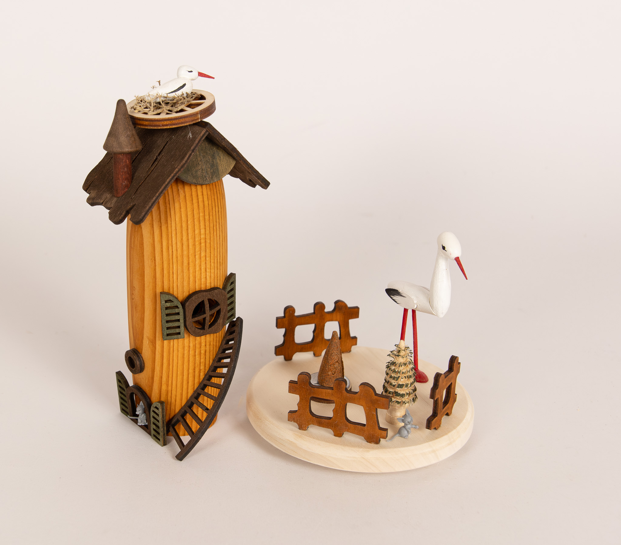 Zde přichází jaro – roztomilá kadidelnice s figurkou čápa, zdobená čapím hnízdem, malými myškami, okny, dveřmi a malým stromkem.