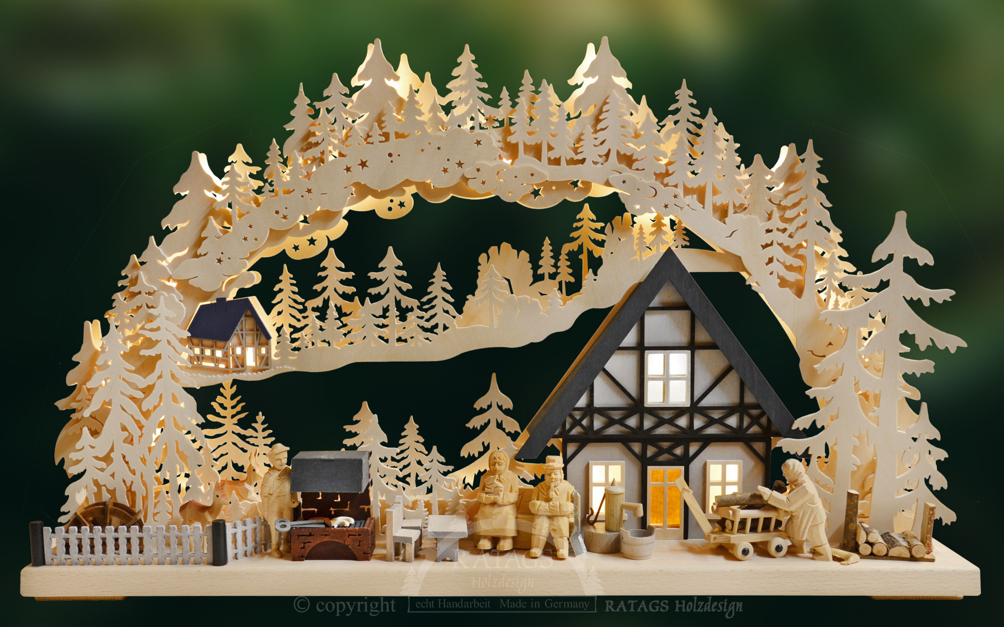 V hustém lese, pod velkým smrkem, se nachází malá lesní chata. Lesník a jeho pes se právě vrátili z procházky lesem a kochají se pohledem na krásně vyřezávané šišky vysoko v korunách smrků. Obdivují také nařezané a nasazené šišky. Náročná práce na jedli je osvětlena nepřímým LED osvětlením a dodává každému divákovi slunečnou náladu. Skutečná ruční práce z dílny RATAGS – Vyrobeno v Německu – 100 % originál z Krušných hor Rozměry: 38 x 72 cm (š x v) Osvětlení: LED, 20 dílů Provedení: ručně malované hnědé