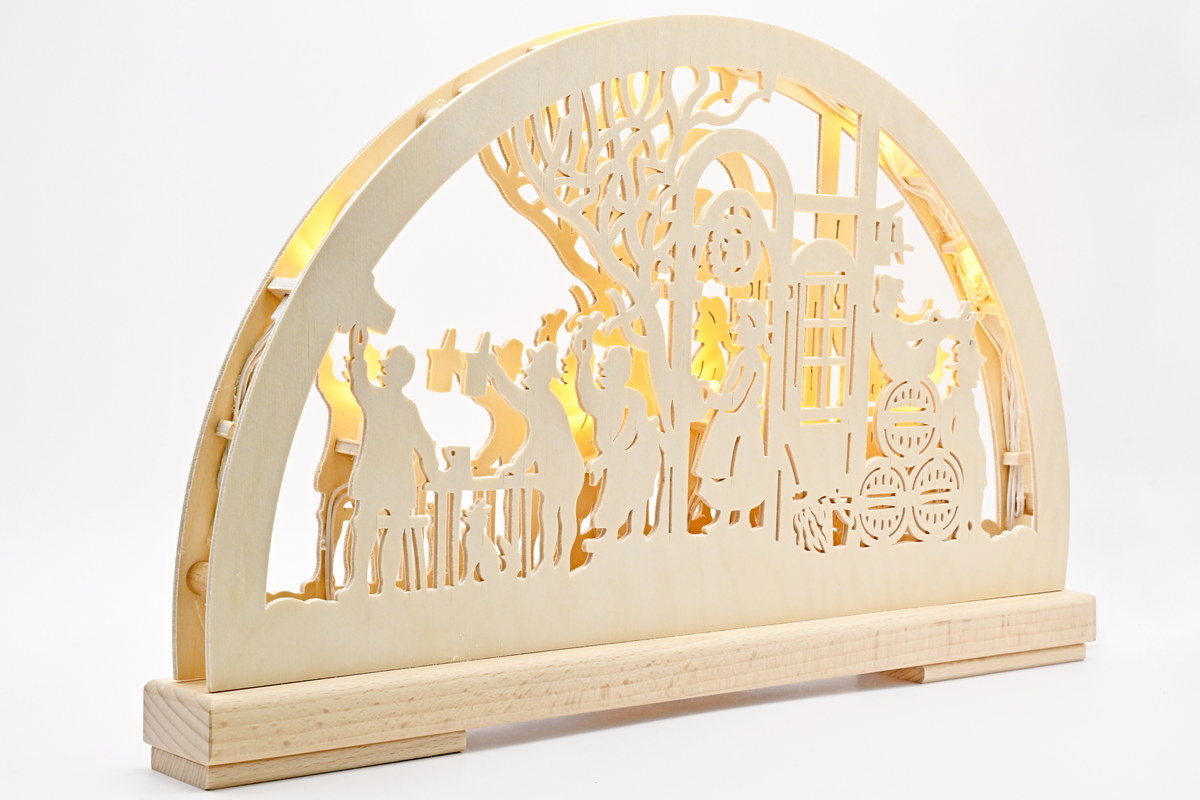 Rozměry: 43 x 30 cm (š x v) Osvětlení: LED, 10 dílů Tento velmi krásný originální 3D Schwibbogen z Krušných hor prostě patří do vánoční výzdoby. Filigránová, ručně malovaná práce s pilkou na dřevo je nepřímo osvětlena LED diodami. Před nákladně zpracovaným hrázděným domem, jehož každé okno je zdobeno dřevěnými řezbami z Krušných hor, stojí děti Striezelkinder. Ve 30. letech prodávaly své hračky na trhu, aby pomohly svým rodinám. Symbolické postavy „Striezelkinder“ byly v roce 1937 oceněny zlatou medailí na světové výstavě v Paříži. Skutečná ruční práce z dílny RATAGS – vyrobeno v Německu – 100% originál z Krušných hor.