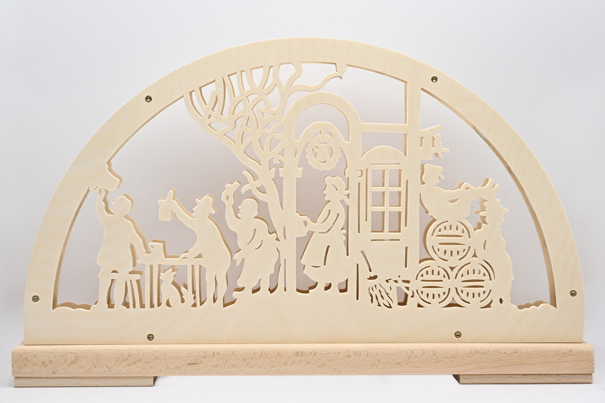 Tento Schwibbogen radosti ze života zobrazuje veselý ruch v hospodě. Scénu oživují hosté, kteří se zdraví a žádají o obsluhu, vstřícný hostinský a usilovný personál. Pod stolem čeká pejsek na spadlé kousky jídla a dva pijáci už střízlivě popíjejí u sudů s vínem.