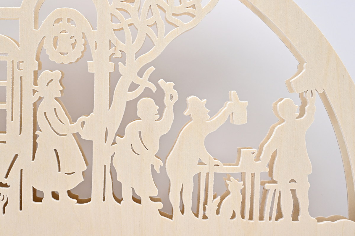 Rozměry: 43 x 30 cm (š x v) Osvětlení: 10dílná světelná řetěz V tomto detailním Schwibbogenu je zachycena ruční práce. Schwibbogen je vybaven soustruženými figurkami, sedacími soupravami, stojací lampou, šicími stroji a mnoha bytovými doplňky a vybízí k úžasu a posezení. Skutečná ruční práce z dílny RATAGS – vyrobeno v Německu – 100% originál z Krušných hor