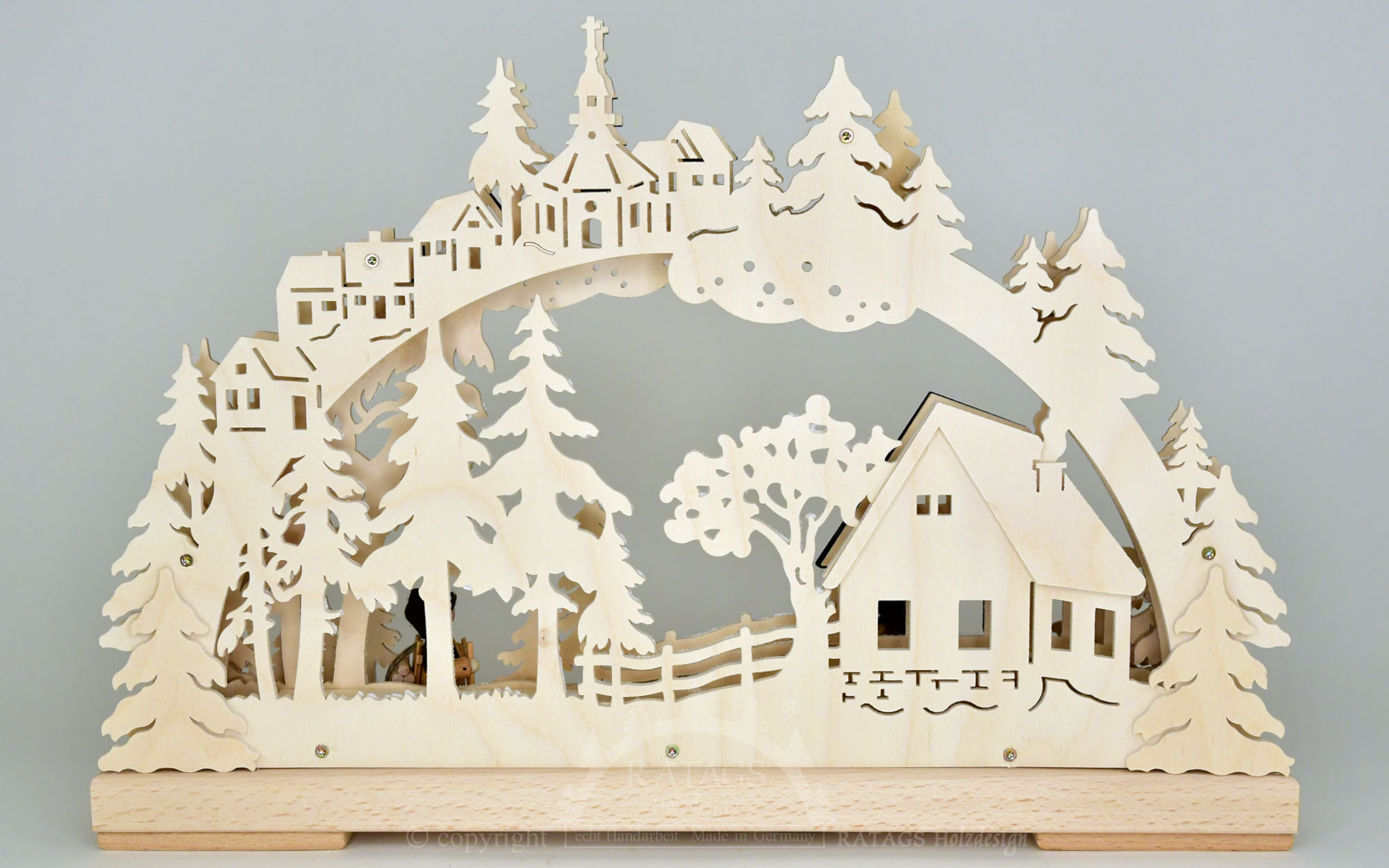 Denne idylliske 3D-lysbue med indirekte belysning viser det traditionelle landliv i Erzgebirge. To figurer trækker på gammeldags vis en slæde lastet med træ og bærer træet på ryggen i en rygsæk. Et diskret farvet bindingsværkshus og legetøjsbyen Seiffen med sin markante bjergkirke fuldender billedet. De farvede tage skaber smukke blikfang i det ellers naturlige udskæringer i birketræ. Glitrende rimfrost fuldender denne lysbue fra Erzgebirge.