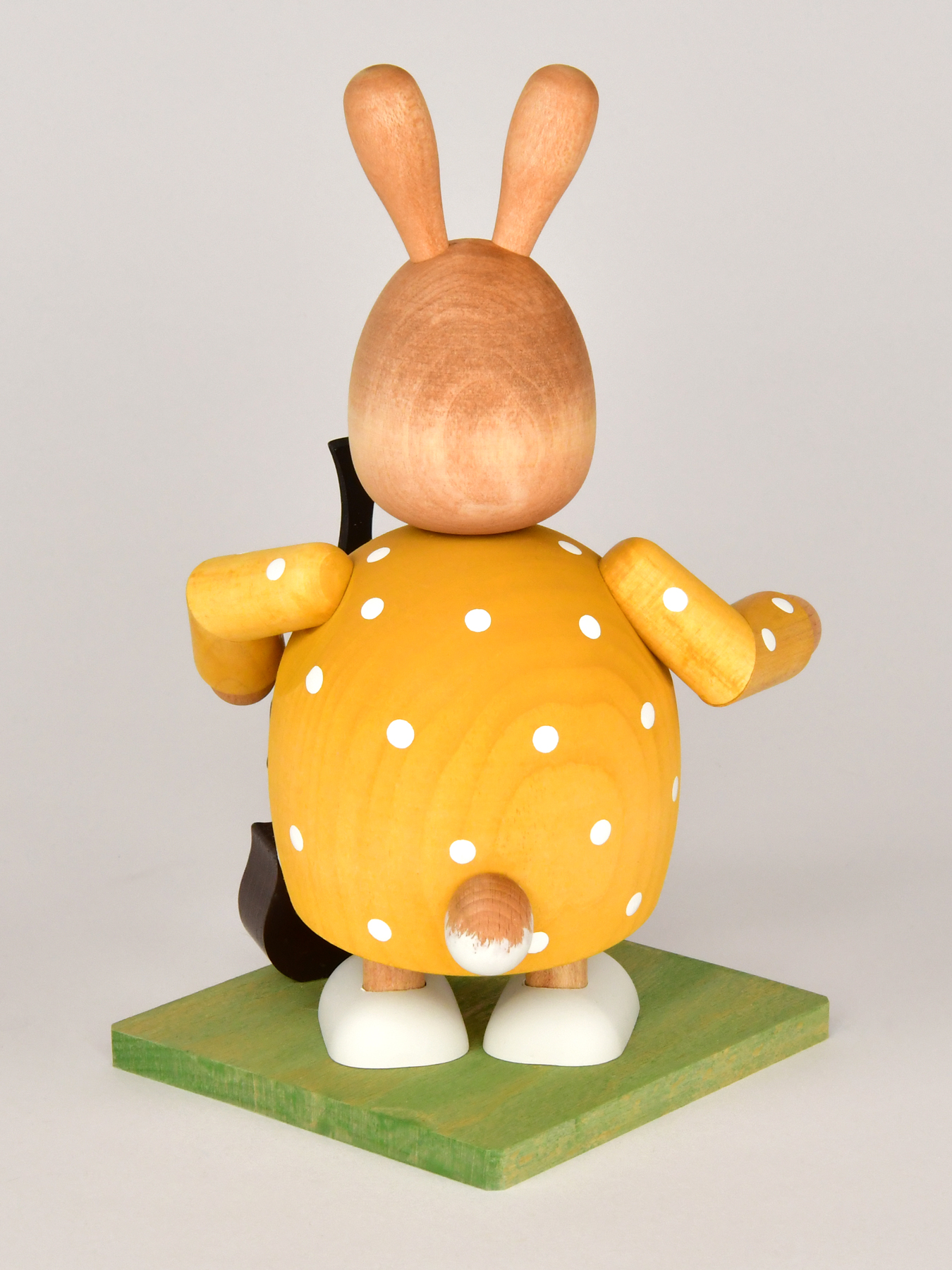 Højde ca. 12 cm. Ægte håndværk – Made in Germany – 100 % original Erzgebirge. Denne kanin fra vores serie af søde kaniner bærer en grøn filtforklæde, et slips og en solsikke som hat.