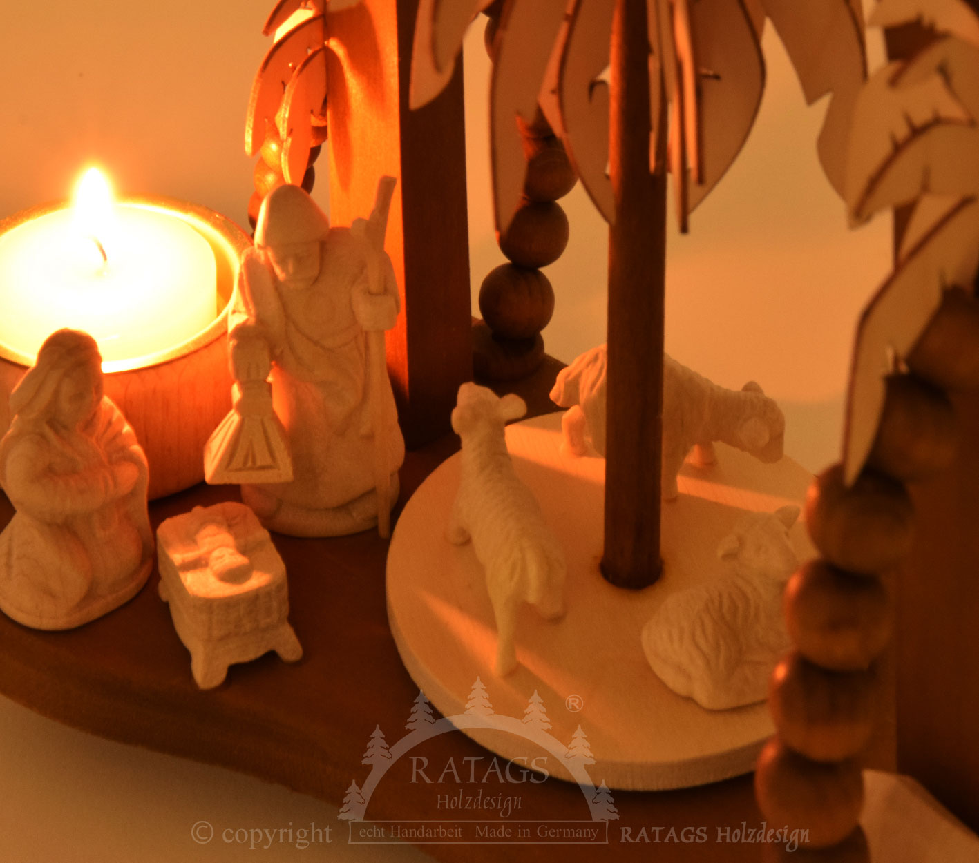 Den hellige nat er brudt frem. Josef og Maria betragter glædeligt Jesusbarnet. Hyrden er meget forbløffet, da han ser dette mirakel med egne øjne. Fårene har lagt sig under en palme, og æslet står også der. Alle figurer er håndskårne. Den massive træpyramide drives af to fyrfadslys, der sættes i de dertil indrettede fyrfadslysestager af massivt træ.