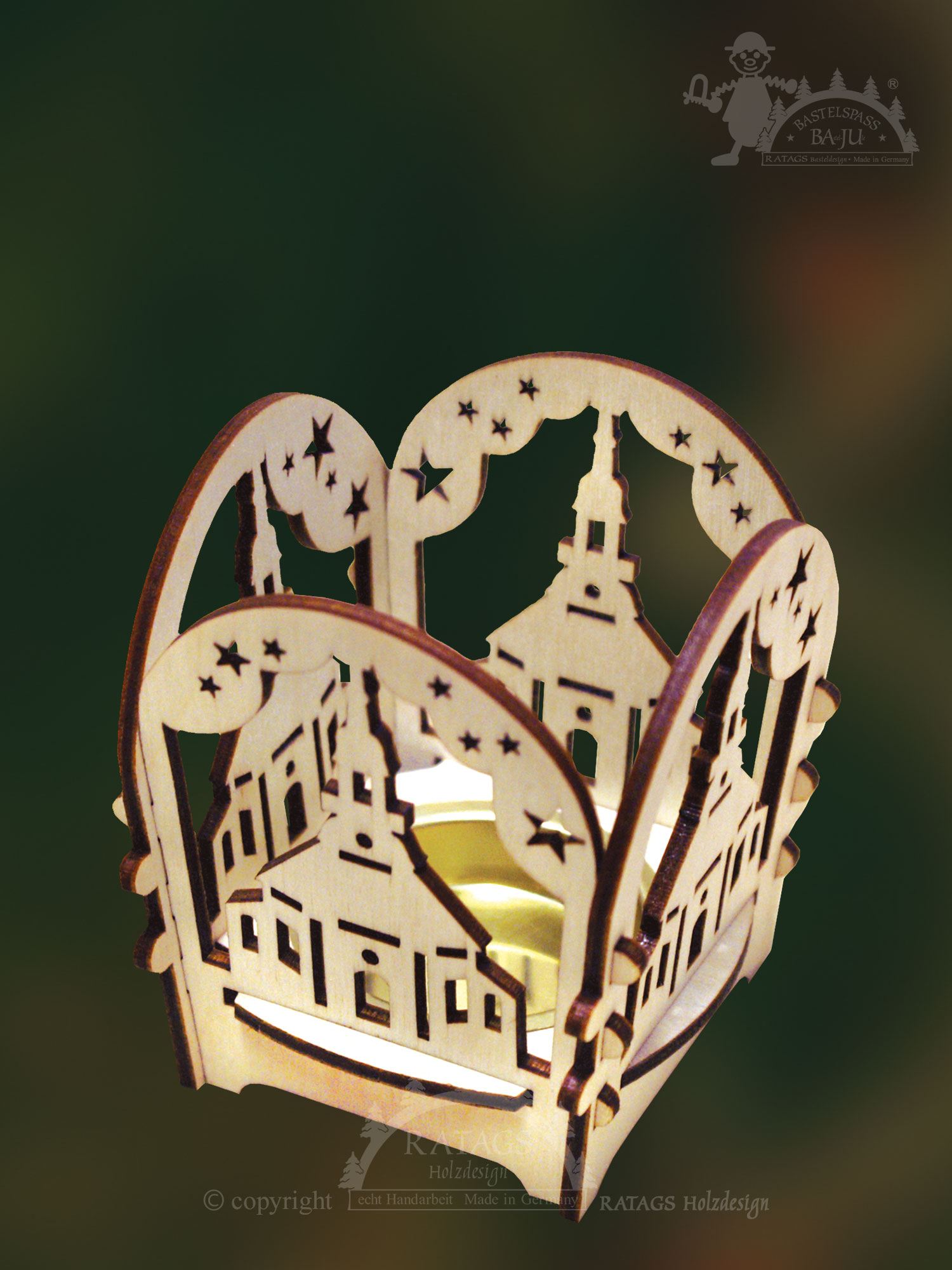 Inhalt: 4 ausgesägte Motive, 1 Teelichthalter