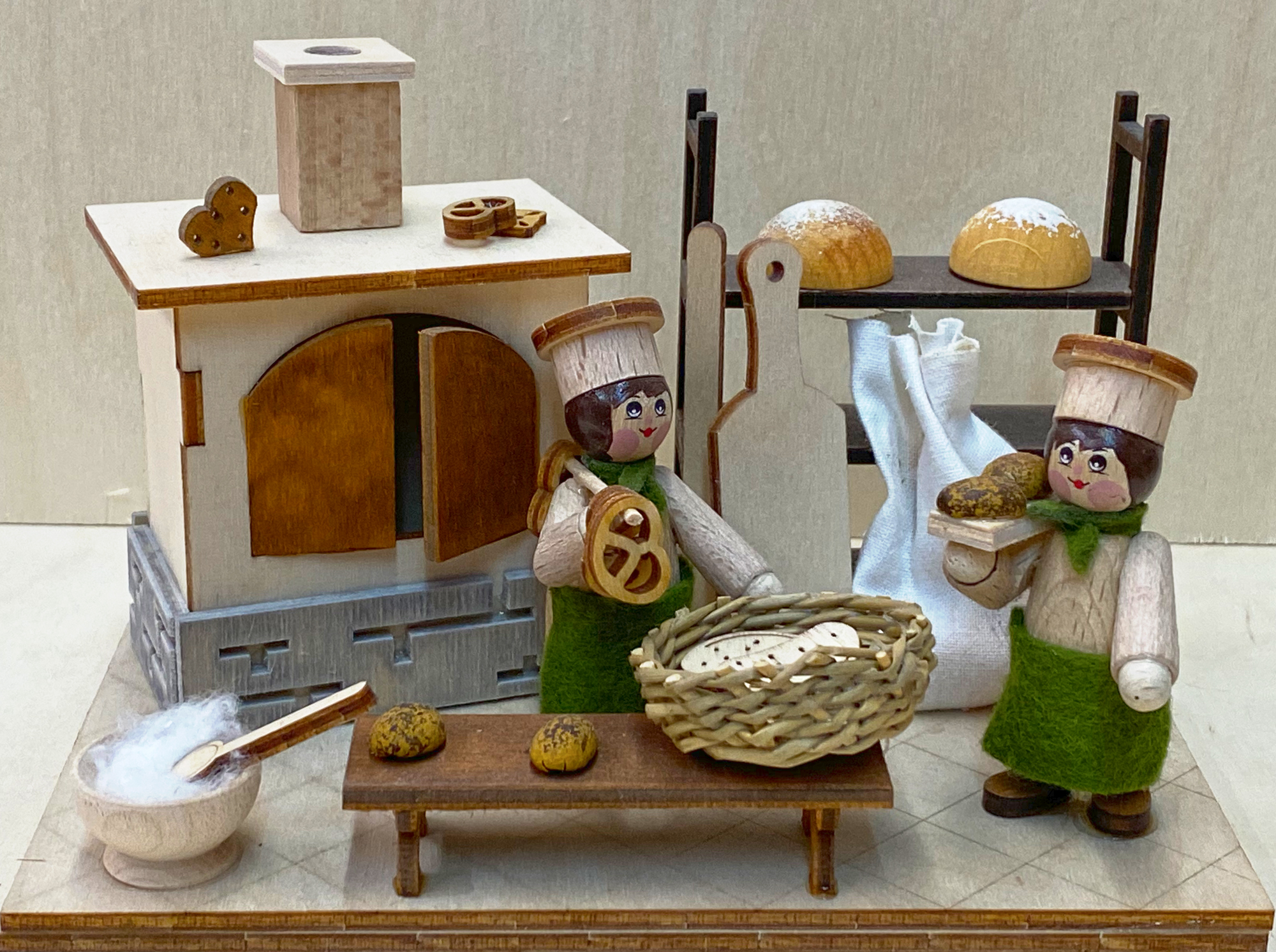 Niedliches Räucherhaus in einer Bäckerei. Die Bäckerei besitzt zwei Bäcker, Brot, Mehlsack und viele weitere schöne Accessories.