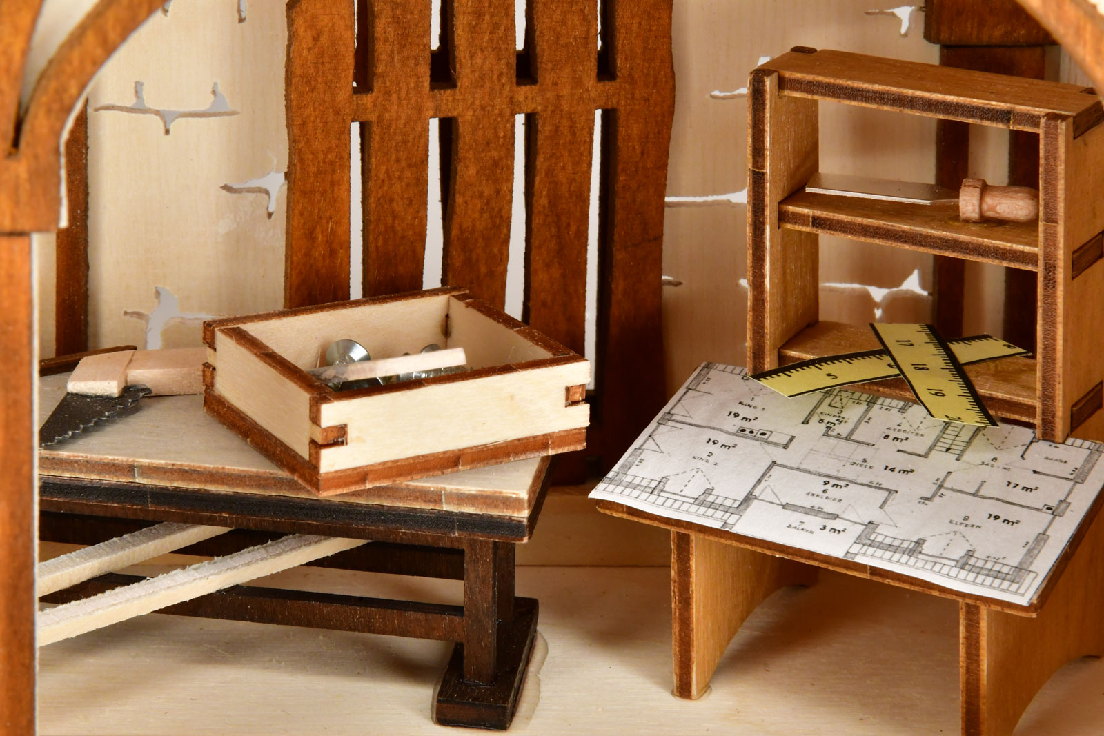 Jeder Handwerker, Tischler oder Künstler ist froh über einen Platz um seine Utensilien wie Holz, Werkzeug und andere Bauutensilien zu lagern. Dieses Tischlerlager befindet sich in einem farblich braun abgesetztem Gewölbekeller. Eine Kreissäge, eine Holzsäge, ein Regal mit Holzleisten und Klötzern, ein Werkzeugkoffer, zwei Werkbänke, und viele kleine Werkzeuge runden das Gesamtbild ab. Eine rundum gelungene Unterbank für viele Schwibbögen aus unserem Sortiment.