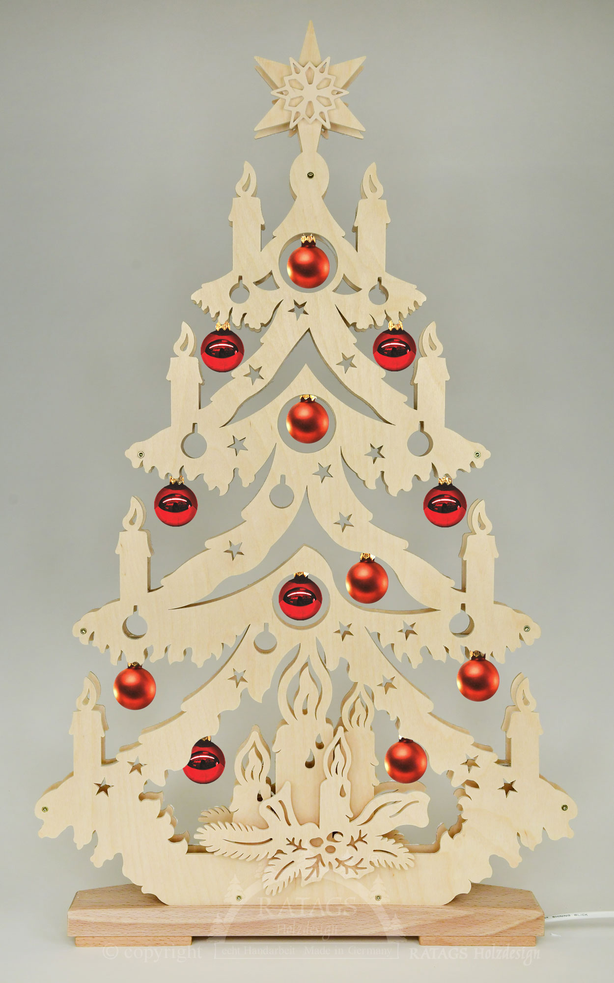 Größe ca. 23,5 x 33,5 x 5 cm (BxHxT) Beleuchtung: 10er LED-Lichterkette, Voll-USB Ausführung: grün gebeizt, grüne Kugeln Dekorative Tanne aus Birkensperrholz mit echten Glaskugeln. Die blendfrei verbaute LED-Beleuchtung verbreitet ein stimmungsvolles Licht. Die Tanne ist grün gebeizt. Die USB-Stromversorgung kann per Powerbank erfolgen und ermöglicht so eine netzunabhängige Aufstellung. Echte Handarbeit aus dem Hause RATAGS - Made in Germany - 100% original Erzgebirge