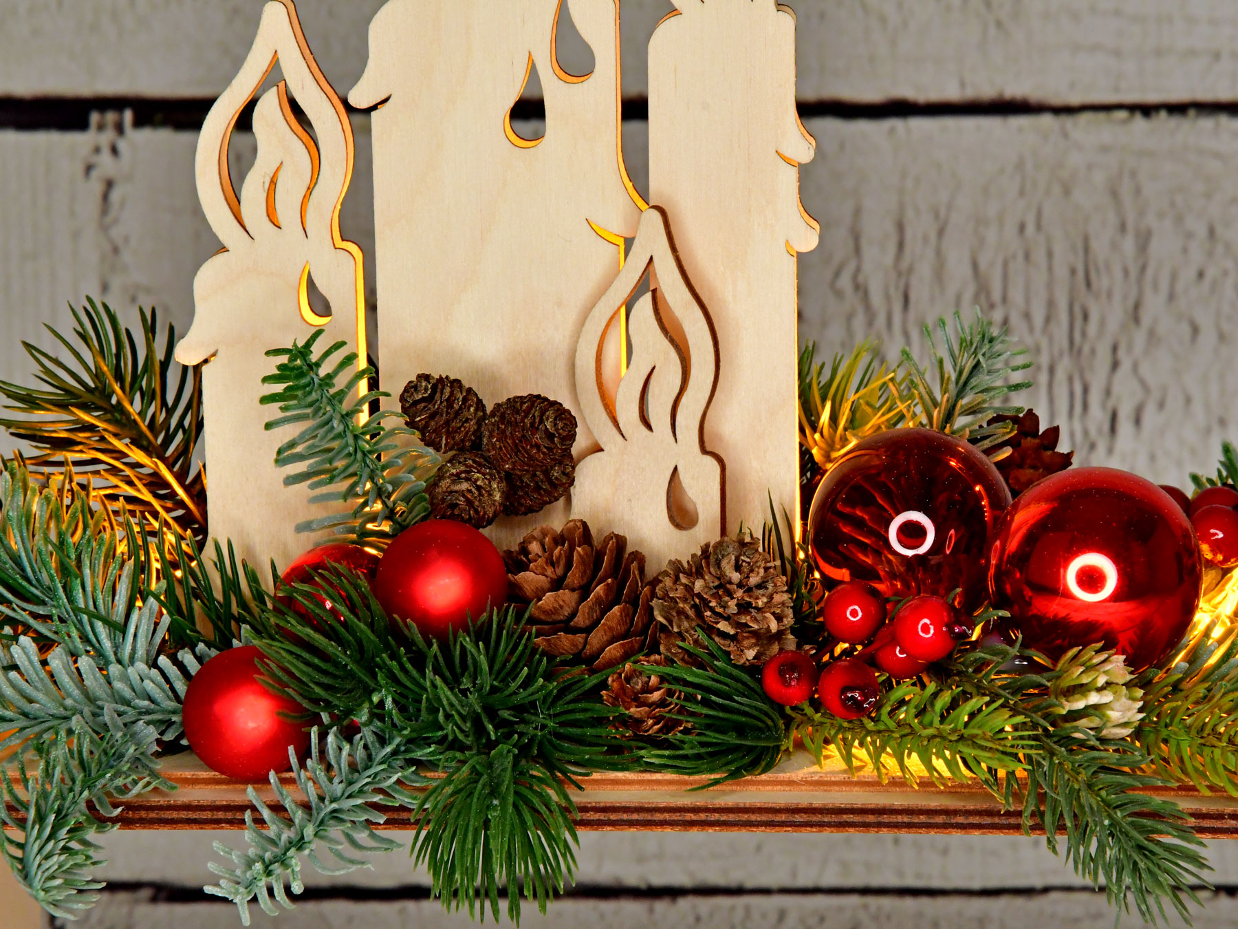 Dekobord "Kerzenschein" bestückt mit Tannenzweigen, Baumkugeln, Zapfen und Beeren. Ideal für Anrichten und Fensterbänke. Auch perfekt geeignet zum Bestücken von Figuren und Co.