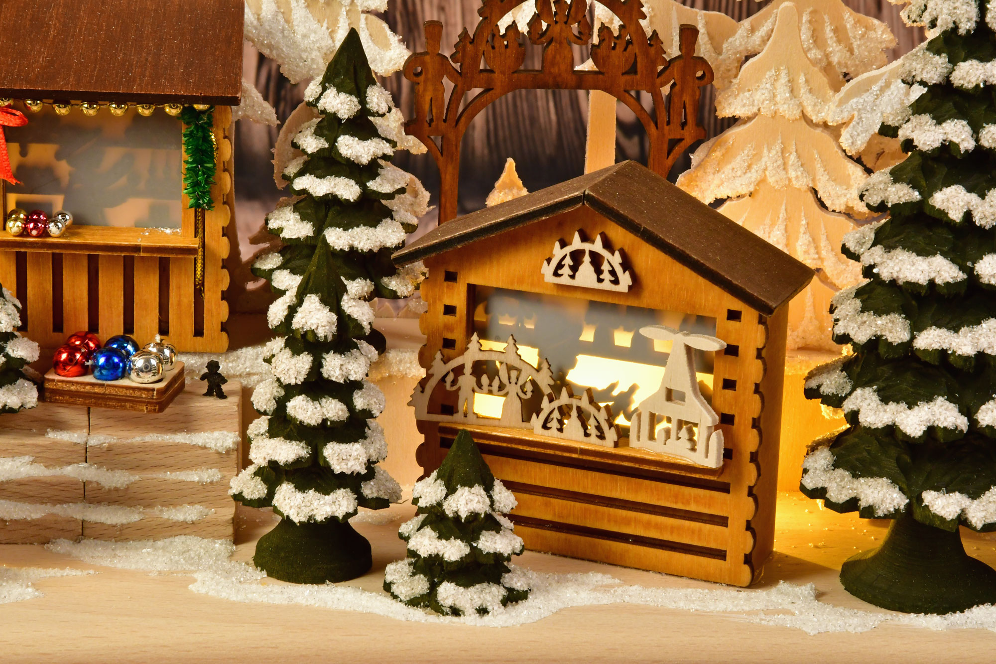 Διαστάσεις: 72 x 43 cm (ΠxΥ) Φωτισμός: LED, 20 τεμάχια Πρόσθετο: ηλεκτρική πυραμίδα Οι προετοιμασίες για τα Χριστούγεννα είναι σε εξέλιξη. Δύο χωρικοί αρχίζουν να στολίζουν το χωριό. Η μεγάλη εξωτερική πυραμίδα έχει ήδη στηθεί. Μια γυναίκα με καροτσάκι παρακολουθεί τη φασαρία. Το χωριό περιβάλλεται από πυκνό δάσος, ο τροχός του νερόμυλου περιμένει τις επερχόμενες εργασίες. Στο βάθος διακρίνεται ένας βράχος από ψαμμίτη. Όλα τα φιγούρα είναι κατασκευασμένα από μασίφ ξύλο και βαμμένα με χρώμα. Η πυραμίδα μπορεί να περιστραφεί με ένα ξεχωριστό διακόπτη. Ο αντιανακλαστικός φωτισμός LED βυθίζει τη σκηνή σε μια ατμοσφαιρική ατμόσφαιρα. Ένα πραγματικό συλλεκτικό κομμάτι. Αληθινό χειροποίητο προϊόν από την εταιρεία RATAGS - Κατασκευασμένο στη Γερμανία - 100% αυθεντικό από τα Όρη Erzgebirge
