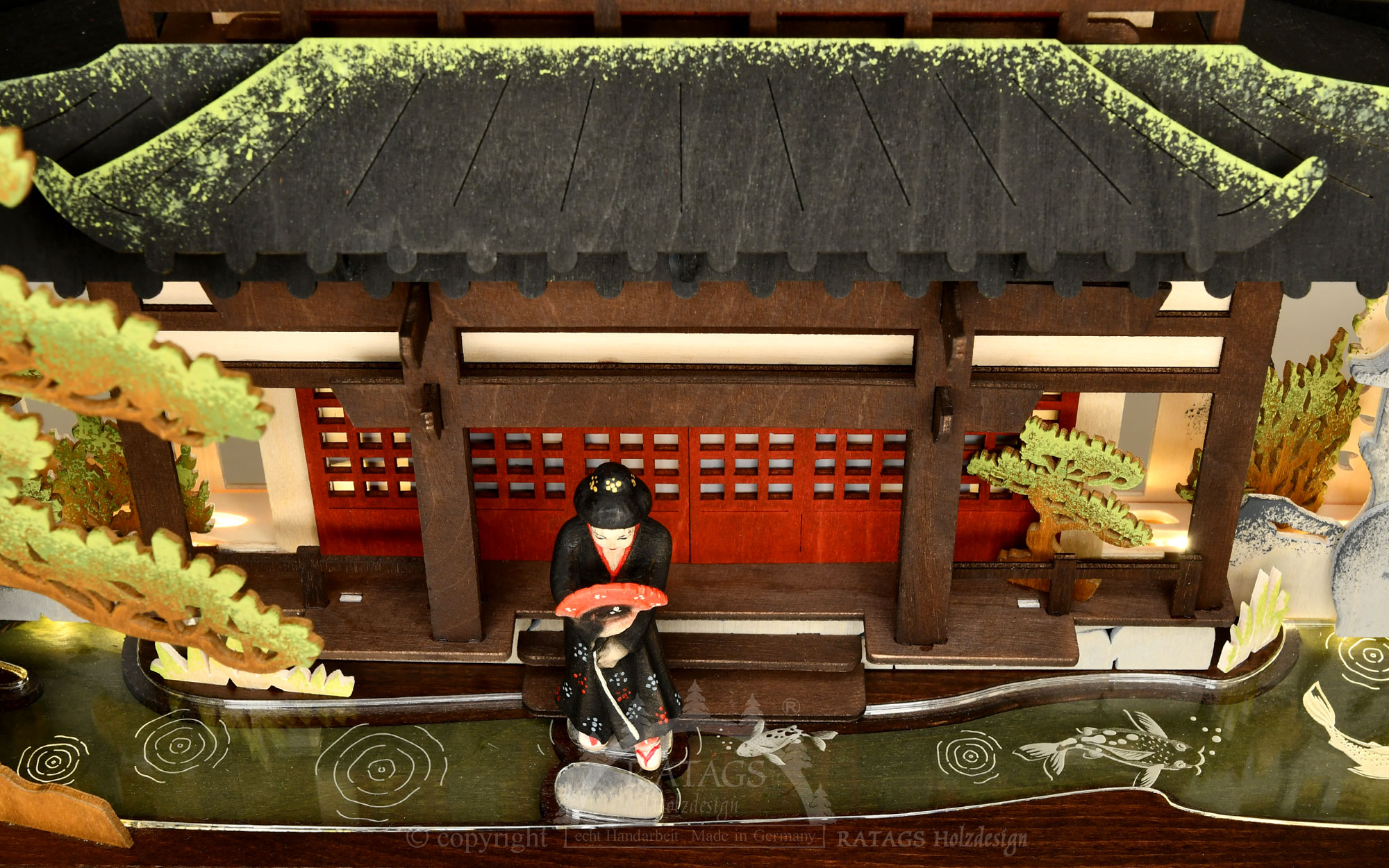 This superlative candle arch with the flair of the Far East not only uses a new material for the water surface, acrylic glass, but also offers an additional function when the shutters are opened, which releases another effect, namely the play of shadows. In the now open window, you can see the silhouette of a couple sitting at the table. They are sitting in a traditional Japanese house with curved roofs on a property surrounded by water. Two women with typical Japanese accessories, umbrellas and fans, are walking across the watercourse in traditional dress. Both figures are made of solid wood and coloured by hand. A small bridge leads from one bank to the other, and stones also form a crossing. Ripples play on the effectively illuminated water and a few fish swim by. This candle arch is fully coloured. In addition to safety and economy, the USB power supply also offers the advantage of flexible installation and the wide compatibility of a USB Type A connector, e.g. with a power bank or any power supply unit.