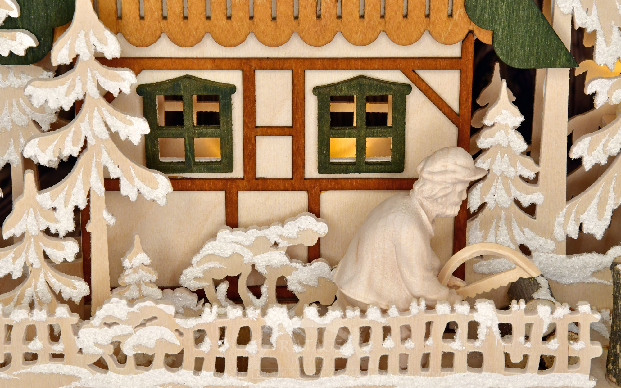 Two lovingly and intricately carved figures illustrate the Altseiffen craft in this 3D Schwibbogen. With a handcart full of wood and a backpack, they work in front of a green and yellow coloured house. A green bench invites you to linger in the middle of a filigree forest sawn from birch wood. The natural trees form a beautiful contrast to the colourful roofs of the small village in the middle of the light arch. An LED light chain gives it a cosy glow and makes both the windows of the house and the stars in the sky shine.