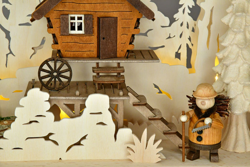 A house stands by a stream, accessible via a staircase, in front of a rushing waterfall in the background. Three hard-working self-sufficient people go about their business: firewood is collected for the cold days, water is fetched and the grandfather takes care of a small fir tree for the parlour. A mighty oak tree provides shade and sandstone rocks border the scene. An atmospheric 3D candle arch with a special depth effect. All figures and several fir trees are made of solid wood. A special effect is created by the use of Plexiglas inlays for the water element.
