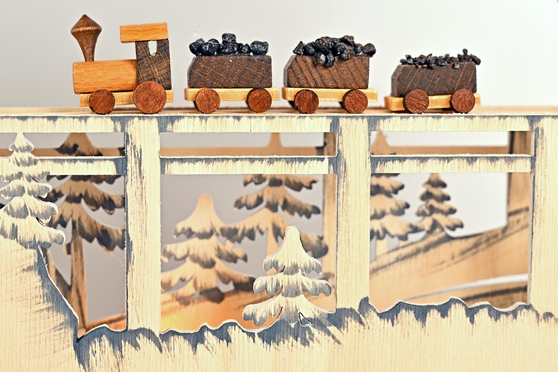 This opulent RATAGS Schwibbogen shows a detailed representation of underground mining on different levels. Miners carry out typical tasks, working their way through the rock massif and extracting valuable ores. Above ground, an illuminated half-timbered house and a makeshift bridge for the mine railway can be seen. In keeping with the theme, a rocky massif covered with conifers arches decoratively over the mine. The hand-painted grey shading creates spatial depth and a great sense of liveliness. The glare-free LED lighting creates an atmospheric ambience. This high-quality RATAGS candle arch will not only delight mining enthusiasts and friends of the Ore Mountains.