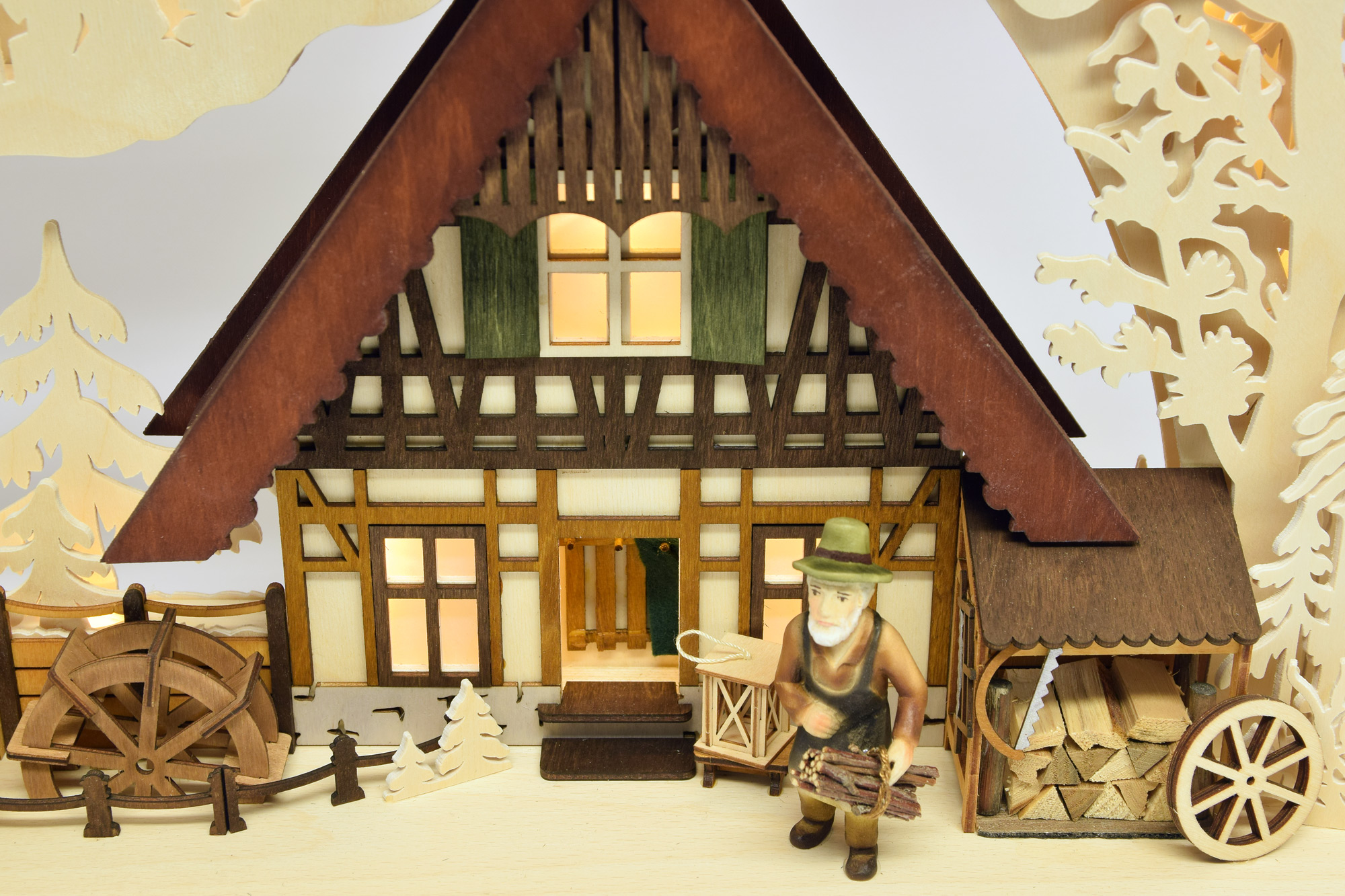 This opulent candle arch depicts the work of a former sawmill. The sawmill is powered by water energy via a mill wheel. The indirectly installed, glare-free LED lighting creates a cosy atmosphere. A decorative piece of handicraft not from RATAGS.