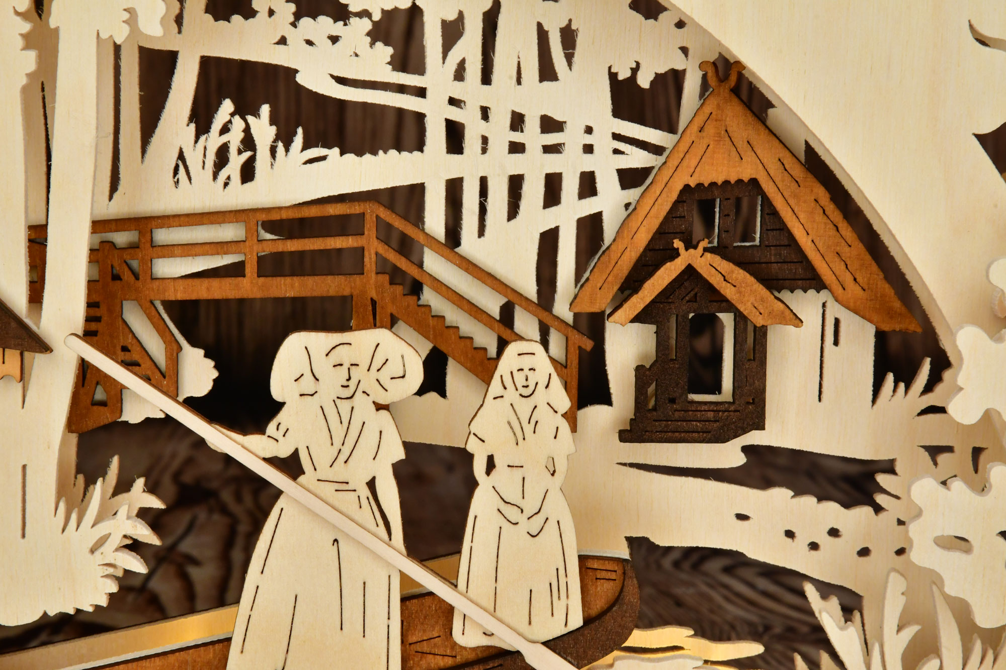 Size: 62 x 40 cm (WxH) Lighting: LED, 20 pieces The 3D Schwibbogen "Am Waldbach" radiates the peace of mature age. An elderly couple enjoy the gentle murmur of a stream on a bench in front of their house. Their little dog keeps them company. Two deer roam through the garden and ducks swim under a small bridge, making this Erzgebirge light arch a symbol of peace and serenity. All figures are hand-carved in detail. A strategically placed LED light chain provides cosy lighting. Genuine handicraft from RATAGS – Made in Germany – 100% original Erzgebirge