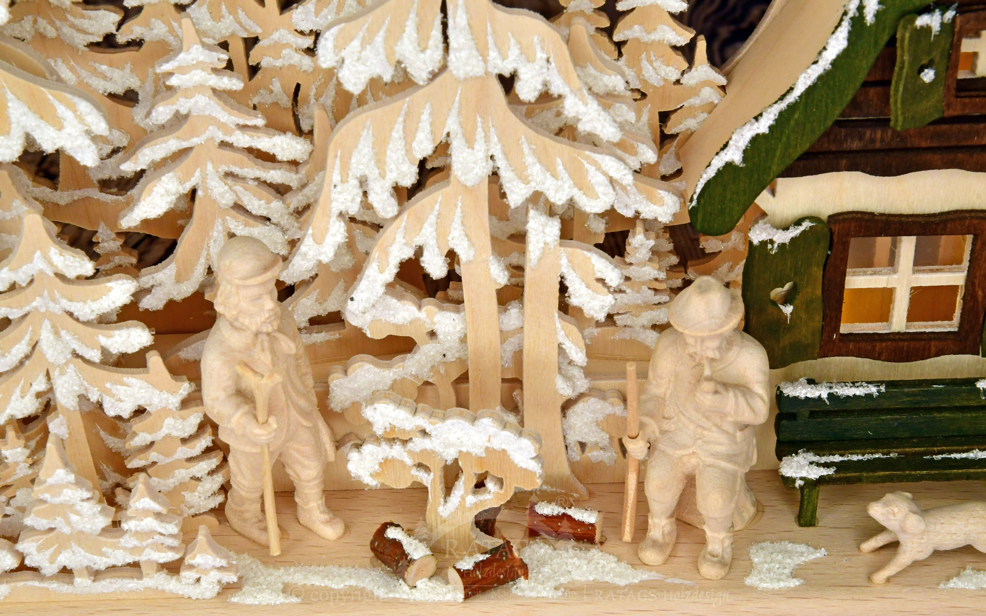 in front of a lovingly designed hunting lodge, comfortably smoking a pipe with his dog at his feet. A hiker keeps them company. The figures are carved and the hut, painted in shades of brown and green, is a beautiful eye-catcher in the otherwise natural 3D candle arch. The traditional fretwork made of 3 mm thick birch plywood is artfully illuminated by a string of LED lights and is a beautiful room decoration for nature lovers all year round. Our 3D candle arch has been lovingly decorated by hand with frosty hoarfrost.