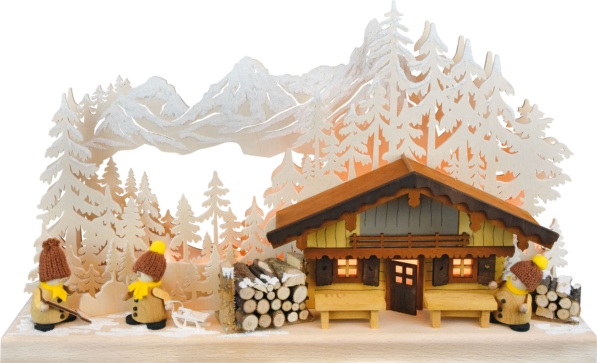 Size: 72 x 43 cm (WxH) Lighting: LED, 20 pieces Design: Hoar frost Genuine handicraft from RATAGS – Made in Germany – 100% original Erzgebirge Cozily sitting on the bench in front of the "Jägerklause" smoking his pipe, a forest worker waits for his colleague, who is approaching from the forest with his ladder cart. This elaborate and detailed candle arch is decorated with carved solid wood figures. The glittering hoarfrost gives this candle arch a wintery flair. The indirect, glare-free lighting creates an atmospheric ambience in the room.