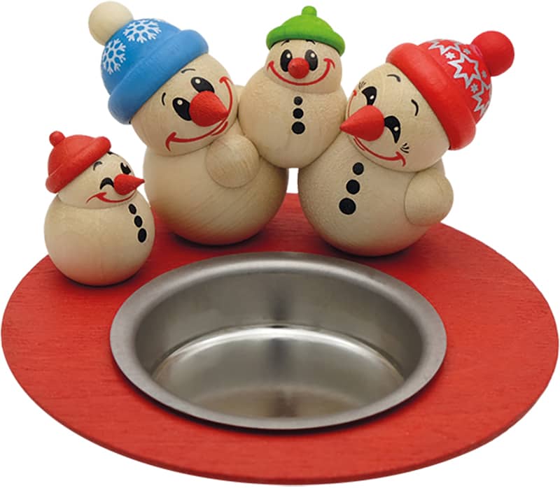 This cheerful snowman family brings winter cheer to your home. Four lovingly designed snowmen with colourful hats adorn the red base with tea light holder. A handmade detail piece from the Ore Mountains that conjures up warmth and cosiness during Advent and winter.