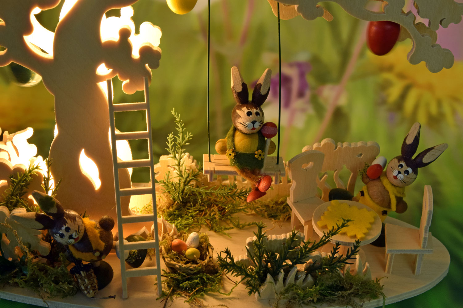 A beautiful Easter tree with LED fairy lights in colourful balloons. A bunny rocks while a wobbly rabbit prepares the picnic at a seating area and another is already busy hiding the Easter eggs. Three bird's nests, Easter eggs and floral Easter elements complete this Easter scene.