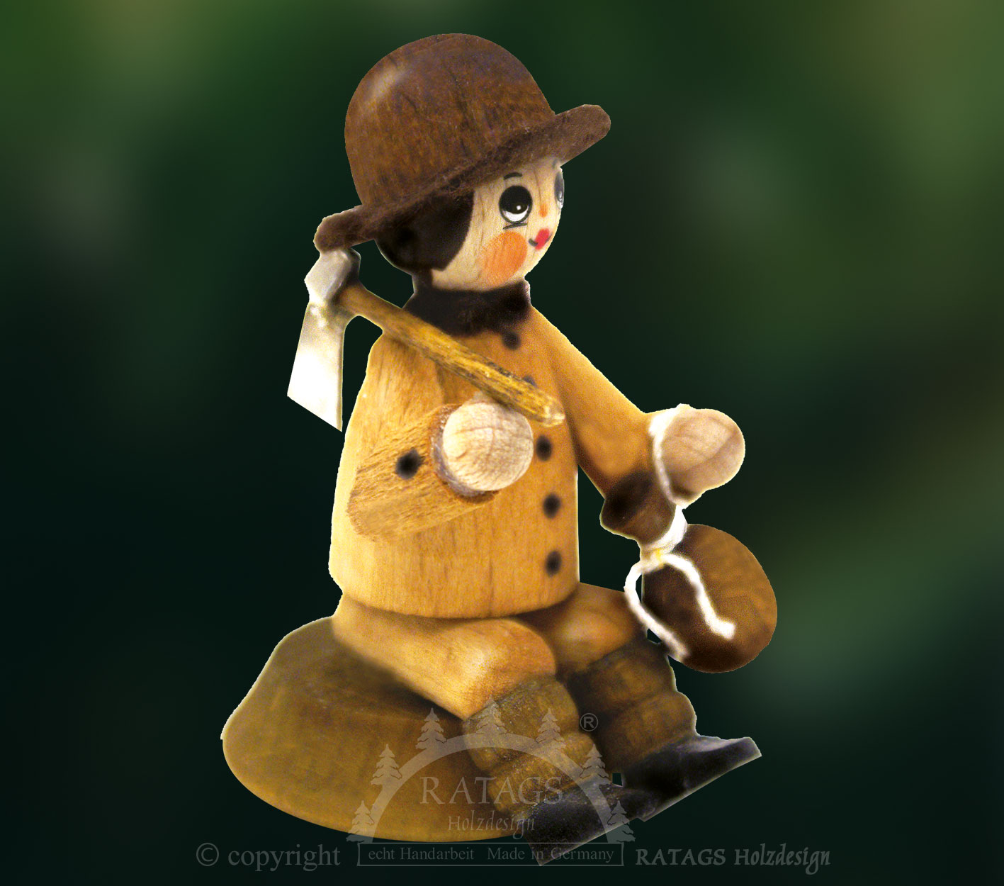 Turned woodcutter sitting on a tree stump, with axe and bag. The hat is made of wood and brown felt.