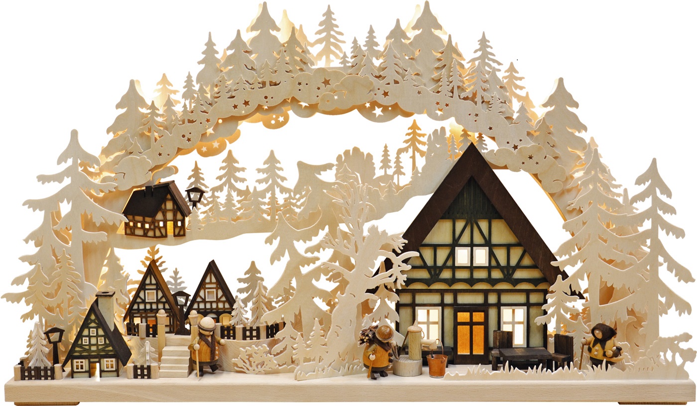 Size: 72 x 42 x 9 cm (WxHxD) Lighting: LED, 20 pieces USB power supply Design: Hoarfrost Two lovingly and intricately carved figures illustrate the Altseiffen craft in this 3D Schwibbogen. With a handcart full of wood and a backpack, they work in front of a green and yellow coloured house. A green bench invites you to linger in the middle of a filigree forest sawn from birch wood. The natural trees form a beautiful contrast to the colourful roofs of the small village in the middle of the light arch. An LED light chain gives it a cosy glow and makes both the windows of the house and the stars in the sky shine. Our 3D candle arch has been lovingly decorated by hand with frosty hoar frost. Genuine handicraft from RATAGS – Made in Germany – 100% original Erzgebirge.