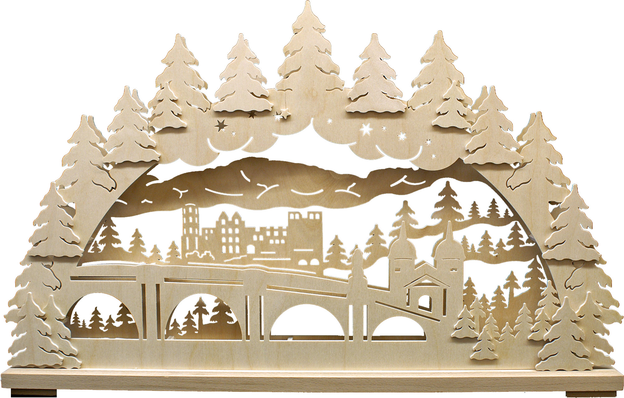 Size: 43 x 30 cm (WxH) Lighting: 10-piece LED light chain This tranquil 3D candle arch with indirect lighting depicts traditional rural life in the Ore Mountains. Two figures pull a sledge loaded with wood in the traditional manner and carry the wood on their backs in a backpack. A subtly coloured half-timbered house and the toy village of Seiffen with its famous mountain church complete the scene. The coloured roofs create beautiful focal points in the otherwise natural birch wood fretwork. Genuine handcrafted by RATAGS – Made in Germany – 100% original Erzgebirge