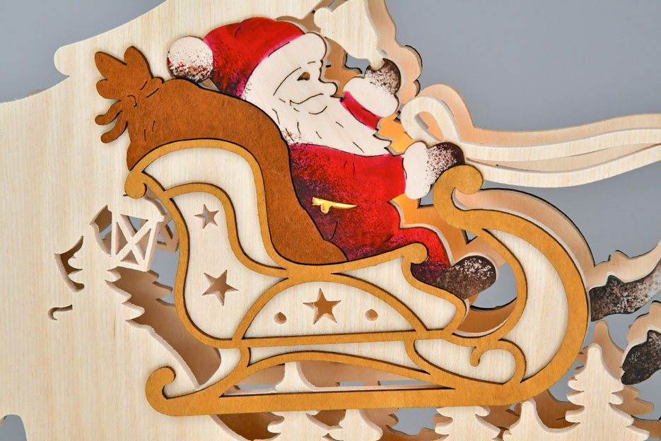 At the centre of this beautiful RATAGS fir tree, Santa's reindeer team flies over a small village. The chimneys are smoking cosily, because it is winter. The fir tree is decorated with stars. Individual colour-stained elements provide accents that contrast with the light birch plywood. The indirect LED lighting creates an atmospheric ambience. Power is supplied via a USB-A interface, offering a high degree of flexibility in terms of placement.