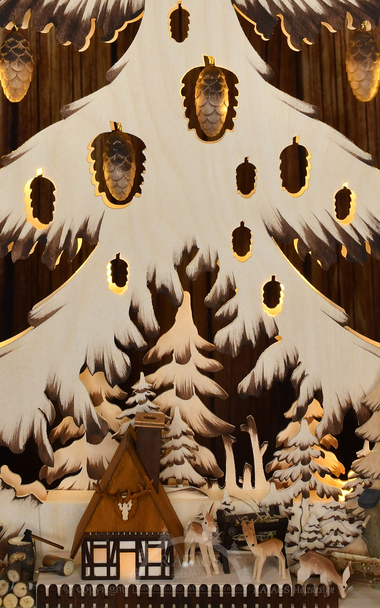 Hidden in the dense green of the forest is a large fir tree with beautifully carved and painted cones. Beneath this fir tree is the forest workers' territory. Three small carved deer are being cared for at the frost house. With enough food from the manger and water from the trough, the three fawns are sure to be back on their feet in no time. Next to the forester's lodge, the felled wood is processed into firewood and stored. Two carved and painted fir trees complete the picture. The fir tree is beautiful to look at when it gets dark, because that's when the indirect LED lighting really comes into its own.