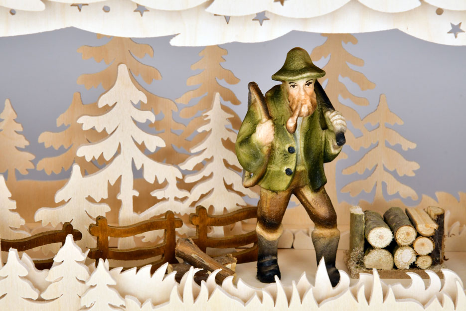 The large room light has a forest motif. The console is made extra special by its detailed design. It depicts a dense forest. Two carved forest people are working on a raised hide. This Schwibbogen extension is the perfect base for many Schwibbögen. Our fretwork radiates a special cosiness thanks to the twenty-piece indirect LED lighting. This room light is the ideal complement to the D9990-548-4-1 candle arch.