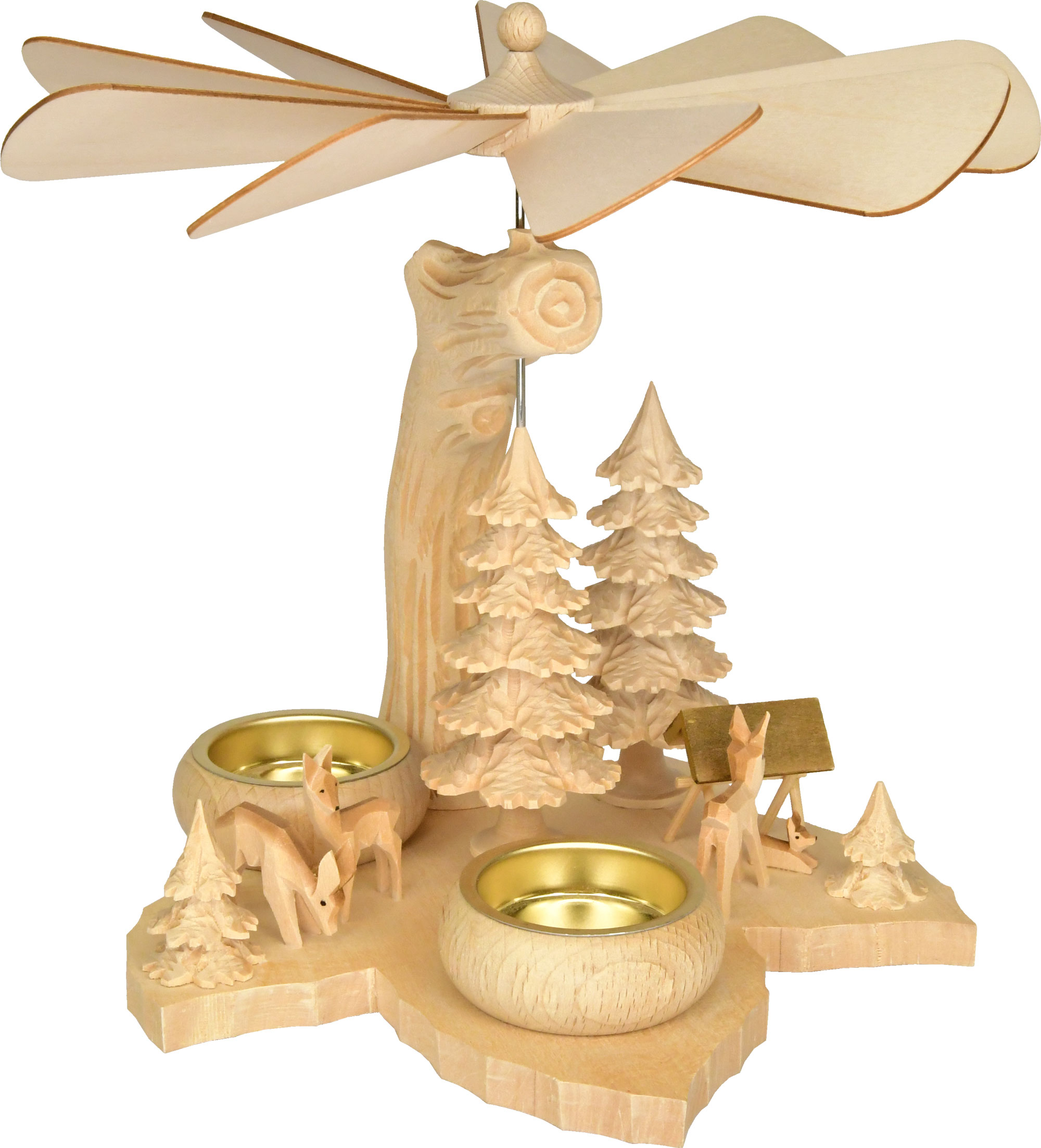 Three carved deer frolic between four carved trees. The large rotating fir tree forms the centrepiece of the solid wood leaf pyramid. The carved tree stump is a particular eye-catcher. The pyramid is powered by two lit tea lights, which are placed in the solid wood tea light holders provided.