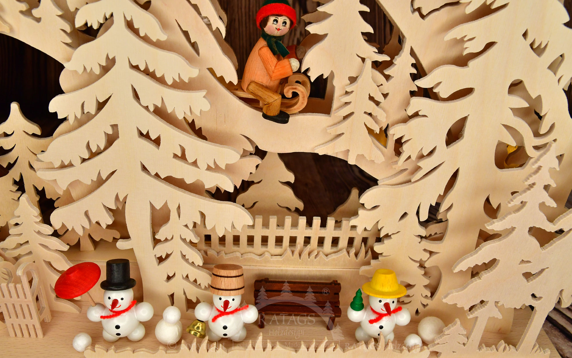 The potatoes are ready. Mum looks after her little ones. There, the first one is already whizzing down the track. Bright children's laughter echoes through the snow-covered valley. In the garden, a cheerful-looking family of snowmen stands by, enjoying the children's winter fun. Here in the romantically dense winter forest, dreams come true. The 3D light arch presented here is indirectly illuminated with LEDs. You will receive this beautiful Erzgebirge handicraft in fine natural wood.