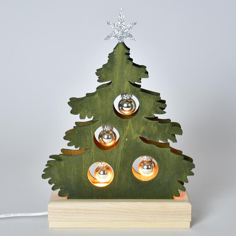 Decorative fir tree made of birch plywood with real glass balls. The glare-free LED lighting spreads an atmospheric light. The fir tree is stained green. The USB power supply can be provided by a power bank, allowing it to be set up independently of the mains.