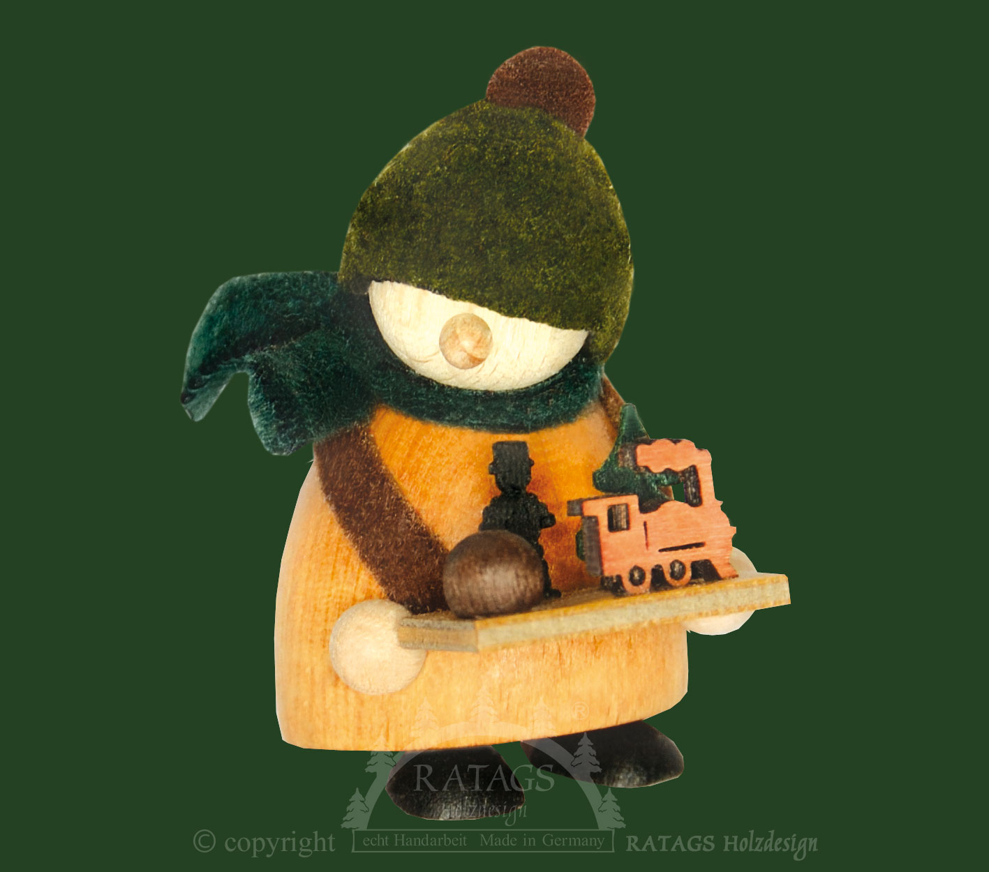 The Molli Striezeljunge is delivered with a small locomotive on his hands. The body has been stained natural. The bobble hat and scarf are made of brown, dark and light green felt.