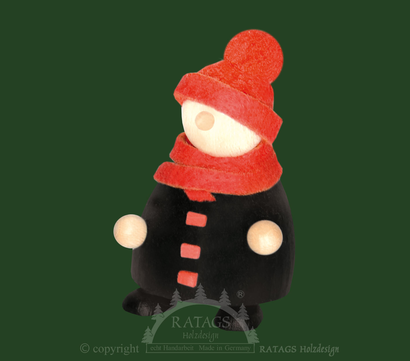 Turned boy with bobble hat and scarf. The body has been stained dark. The scarf and bobble hat are made of red felt.