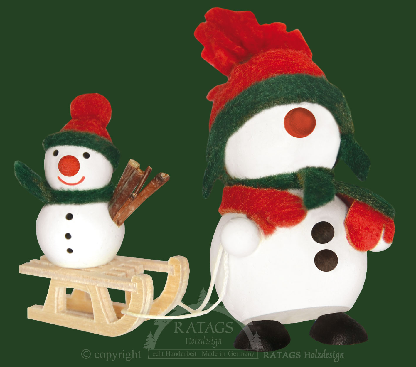 Snowman with sledge and mini snowman. The body has been painted white. The scarf and hat are made of green and red felt.