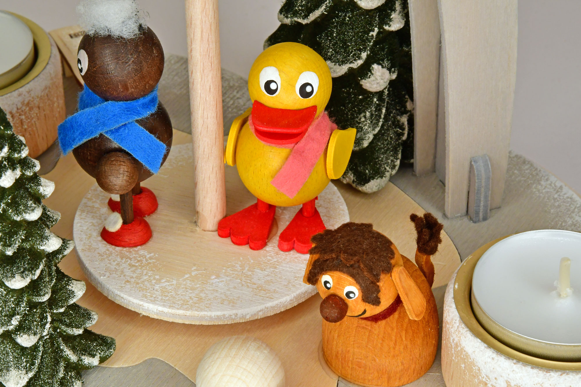 This table pyramid made of coloured birch plywood is a real eye-catcher. The iconic crowd favourites Pitti and Schnattchen have taken their places on the turntable, while Moppi sits on the 'mainland' and stares at two snowballs. The white paint gives the impression of fresh snow. All figures are made of solid wood and painted by hand. Powered by 2 tea lights, this pyramid creates wonderful lighting effects and shadow plays on the ceiling. A beautiful piece of Erzgebirge wood art for the Advent and Christmas season.