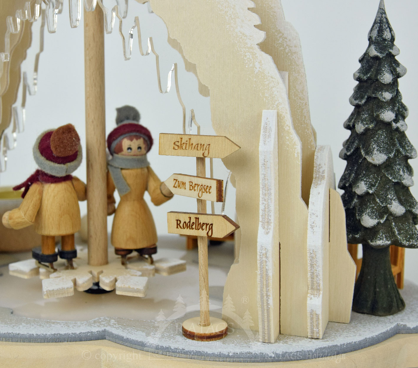 This table pyramid made of light birch plywood is a real innovation: the two RATAGS figures Paul and Paula are doing a pirouette on the ice on their skates. An inlaid plexiglass disc imitates the reflective ice surface. The pyramid bearing sits in the middle. Small changeable shoes for our ice skaters are ready at the edge of the ice surface. Frosty icicles hang from the rock massif on which small fir trees grow. Most of the attachments and the two figures are made of solid wood. The white paint gives the impression of fresh snow. Powered by two tea lights, this pyramid creates wonderful lighting effects and shadow plays on the ceiling. A beautiful piece of Erzgebirge wood art for the Advent and Christmas season.